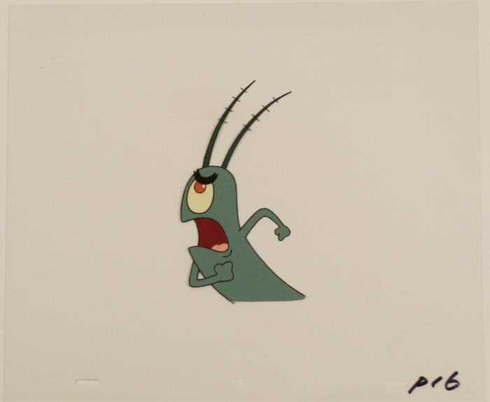 This original animation cel is from the Nickelodeon TV show SpongeBob Squarepants. The story takes place under the deep blue sea in Bikini Bottom, where SpongeBob resides. SpongeBob, who is a yellow, porous sponge, is your typical happy-go-lucky character, as he is always cheerful and enjoys making people laugh. Patrick Star, SpongeBob's neighbor who is a starfish, is your average children's show idiot, as he boasts knowing nothing and is often getting himself into ridiculous situations. Between the homes of these two lies the home of the miserable Squidward, a squid, who is known for being grouchy and playing tricks on SpongeBob and Patrick. Both SpongeBob and Squidward work at the Krusty Krab, a fast food business run by the greedy money-loving Mr. Krabs, a crab, the arch rival of the evil, possibly misunderstood, Plankton. Another neighbor, Sandy Cheeks, an athletic squirrel who normally wears an astronaut's space suit, was introduced in "Tea at the Treedome." She spends most of her time inventing and experimenting. Plankton is being assertive.Original Production Animated Cel Overall Size of Cel: 10 1/2" x 12 1/2" Very Good ConditionThis is an original hand-painted cel set-up used in the production of an episode of "SpongeBob SquarePants." Each one-of-a-kind set-up represents a slight change in position of the characters. When individually photographed and projected in rapid succession, the images appear to move.