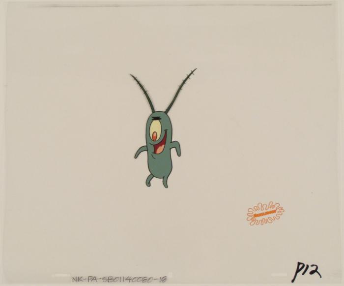 To create production cels, the original animator's drawing is transferred onto an acetate cel (by hand-inking and/or photo copying). The cel is then hand-painted on the reverse side. The cel is ready to be matted and framed. The animator's notations are at the bottom of the cel. There is some slight paint fade to Plankton's outline. There is a Nickelodeon TV logo on the bottom right of the cel.
