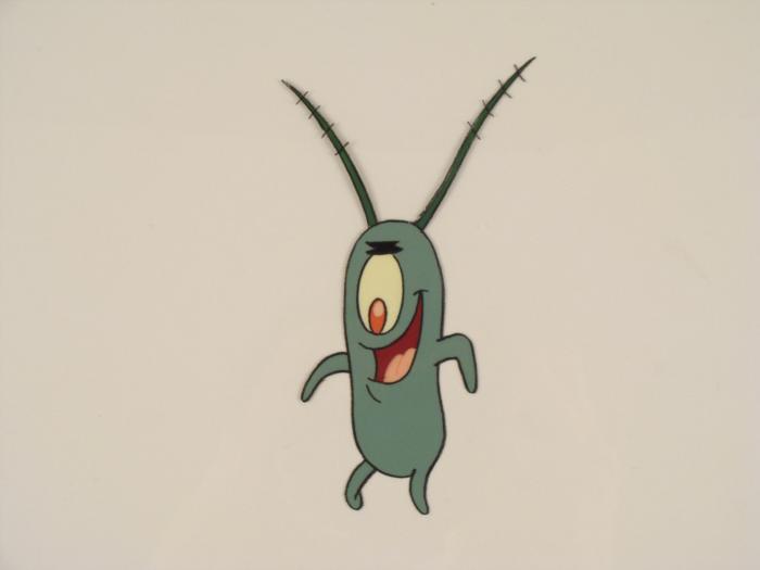 This original animation cel is from the Nickelodeon TV show SpongeBob Squarepants. The story takes place under the deep blue sea in Bikini Bottom, where SpongeBob resides. SpongeBob, who is a yellow, porous sponge, is your typical happy-go-lucky character, as he is always cheerful and enjoys making people laugh. Patrick Star, SpongeBob's neighbor who is a starfish, is your average children's show idiot, as he boasts knowing nothing and is often getting himself into ridiculous situations. Between the homes of these two lies the home of the miserable Squidward, a squid, who is known for being grouchy and playing tricks on SpongeBob and Patrick. Both SpongeBob and Squidward work at the Krusty Krab, a fast food business run by the greedy money-loving Mr. Krabs, a crab, the arch rival of the evil, possibly misunderstood, Plankton. Another neighbor, Sandy Cheeks, an athletic squirrel who normally wears an astronaut's space suit, was introduced in "Tea at the Treedome." She spends most of her time inventing and experimenting. Plankton is about to jump for joyOriginal Production Animated Cel Overall Size of Cel: 10 1/2" x 12 1/2" Very Good ConditionThis is an original hand-painted cel set-up used in the production of an episode of "SpongeBob SquarePants." Each one-of-a-kind set-up represents a slight change in position of the characters. When individually photographed and projected in rapid succession, the images appear to move.