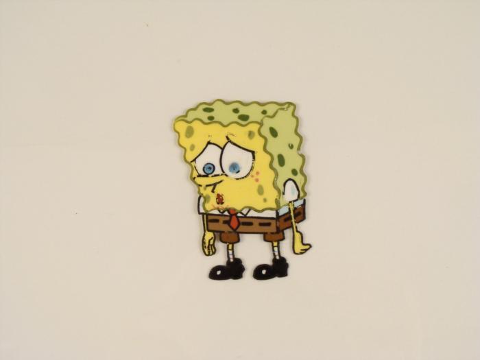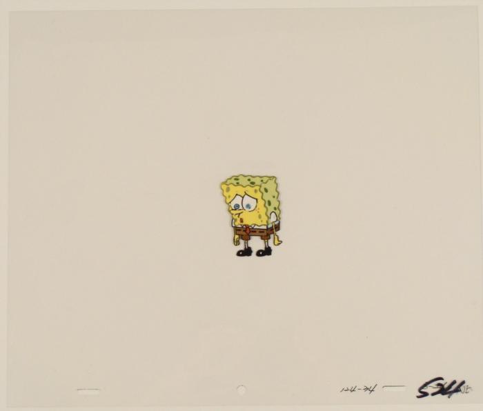 This original animation cel is from the Nickelodeon TV show SpongeBob Squarepants. The story takes place under the deep blue sea in Bikini Bottom, where SpongeBob resides. SpongeBob, who is a yellow, porous sponge, is your typical happy-go-lucky character, as he is always cheerful and enjoys making people laugh. Patrick Star, SpongeBob's neighbor who is a starfish, is your average children's show idiot, as he boasts knowing nothing and is often getting himself into ridiculous situations. Between the homes of these two lies the home of the miserable Squidward, a squid, who is known for being grouchy and playing tricks on SpongeBob and Patrick. Both SpongeBob and Squidward work at the Krusty Krab, a fast food business run by the greedy money-loving Mr. Krabs, a crab, the arch rival of the evil, possibly misunderstood, Plankton. Another neighbor, Sandy Cheeks, an athletic squirrel who normally wears an astronaut's space suit, was introduced in "Tea at the Treedome." She spends most of her time inventing and experimenting. Spongebob is looking at the ground.Original Production Animated Cel Overall Size of Cel: 10 1/2" x 12 1/2" Very Good ConditionThis is an original hand-painted cel set-up used in the production of an episode of "SpongeBob SquarePants." Each one-of-a-kind set-up represents a slight change in position of the characters. When individually photographed and projected in rapid succession, the images appear to move.