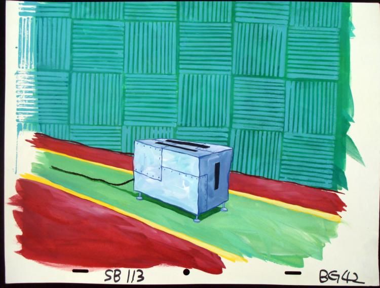 }This original hand-painted background is from the Nickelodeon TVs how SpongeBob Squarepants. The story takes place under the deep blue sea in Bikini Bottom, where SpongeBob resides. SpongeBob, who is a yellow, porous sponge, is your typical happy-go-lucky character, as he is always cheerful and enjoys making people laugh. Patrick Star, SpongeBob's neighbor who is a starfish, boasts knowing nothing and is often getting himself into ridiculous situations. Between the homes of these two lies the home of the miserable Squidward, a squid, who is known for being grouchy and playing tricks on SpongeBob and Patrick. Both SpongeBob and Squidward work at the Krusty Krab, a fast food business run by the greedy money-loving Mr. Krabs, a crab, the arch rival of the evil, possibly misunderstood, Plankton. Another neighbor, Sandy Cheeks, an athletic squirrel who normally wears an astronaut's space suit, was introduced in "Tea at the Treedome." She spends most of her time inventing and experimenting. * Patrick sure looks tired- must have been a good party! * * Original Production Background Overall Size of Background: 10 1/2" x 14" Very good conditionOriginal Production Backgrounds are used in the making of the final version of animated productions. The background establishes the location and the overall good mood of the scene. Typically, a background layout artist creates a drawing to establish the content of the scene, placement of characters, perspective and camera angle. Based on this drawing, the background artist creates a preliminary painting to confirm all of the scenes details, then the final production background which is used in the filming of the scene. When these backgrounds are individually photographed behind the progression of production cels, and projected at a rapid succession, the images in the foreground appear to move, creating an animated scene. * The bottom of the sheet has peg holes, and the animator's notations. *