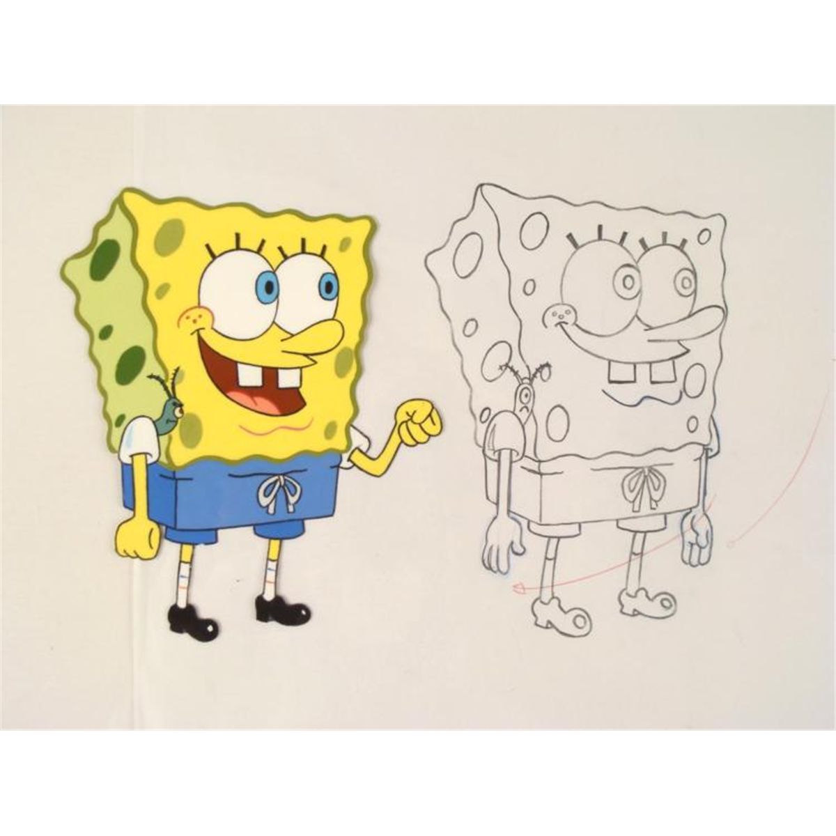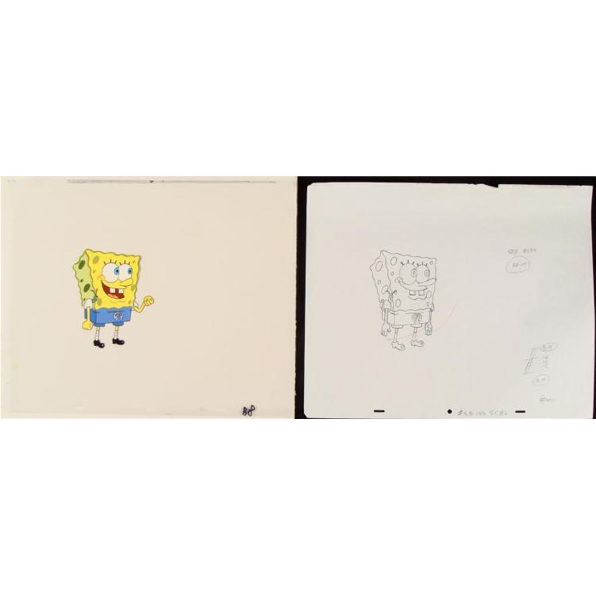 This is an original hand-painted animation cel with closely matching drawing from the Nickelodeon TV show SpongeBob Squarepants. The story takes place under the deep blue sea in Bikini Bottom, where SpongeBob resides. SpongeBob, who is a yellow, porous sponge, is your typical happy-go-lucky character, as he is always cheerful and enjoys making people laugh. Patrick Star, SpongeBob's neighbor who is a starfish, boasts knowing nothing and is often getting himself into ridiculous situations. Between the homes of these two lies the home of the miserable Squidward, a squid, who is known for being grouchy and playing tricks on SpongeBob and Patrick. Both SpongeBob and Squidward work at the Krusty Krab, a fast food business run by the greedy money-loving Mr. Krabs, a crab, the arch rival of the evil, possibly misunderstood, Plankton. Another neighbor, Sandy Cheeks, an athletic squirrel who normally wears an astronaut's space suit, was introduced in "Tea at the Treedome." She spends most of her time inventing and experimenting. * SpongeBob looks like he's saying "Hey there," while Plankton peers from over his shoulder. * * Overall Size of cel and drawing: 16 1/2" x 13 1/2" Very good conditionEach one-of-a-kind set-up represents a slight change in position of the characters. When individually photographed and projected in rapid succession, the images appear to move. * To create production cels, the original animator's drawing is transferred onto an acetate cel (by hand-inking and/or photo copying). The cel is then hand-painted on the reverse side. * This is a double layer cel, with SpongeBob on one sheet, and Plankton on the other. The bottom of the sheets have peg holes, and the animator's notations. *