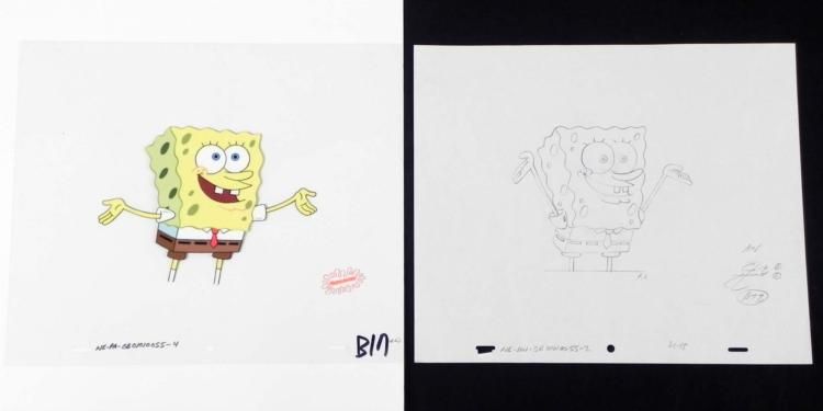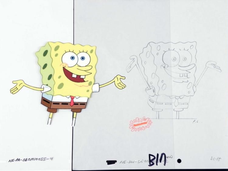 This is an original hand-painted animation cel with closely matching drawing from the Nickelodeon TV show SpongeBob Squarepants. The story takes place under the deep blue sea in Bikini Bottom, where SpongeBob resides. SpongeBob, who is a yellow, porous sponge, is your typical happy-go-lucky character, as he is always cheerful and enjoys making people laugh. Patrick Star, SpongeBob's neighbor who is a starfish, boasts knowing nothing and is often getting himself into ridiculous situations. Between the homes of these two lies the home of the miserable Squidward, a squid, who is known for being grouchy and playing tricks on SpongeBob and Patrick. Both SpongeBob and Squidward work at the Krusty Krab, a fast food business run by the greedy money-loving Mr. Krabs, a crab, the arch rival of the evil, possibly misunderstood, Plankton. Another neighbor, Sandy Cheeks, an athletic squirrel who normally wears an astronaut's space suit, was introduced in "Tea at the Treedome." She spends most of her time inventing and experimenting. * Hey! SpongeBob is here! * * Overall Size of cel and drawing: 10 1/2" x 12 1/2" Very good conditionEach one-of-a-kind set-up represents a slight change in position of the characters. When individually photographed and projected in rapid succession, the images appear to move. * To create production cels, the original animator's drawing is transferred onto an acetate cel (by hand-inking and/or photo copying). The cel is then hand-painted on the reverse side. * The cel has a Nickelodeon logo. The drawing is done with graphite pencil. The bottom of the sheets have peg holes, and animator's notations. *