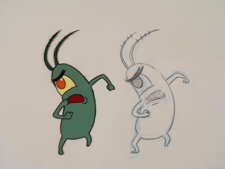 This is an original hand-painted animation cel with matching drawing from the Nickelodeon TV show SpongeBob Squarepants. The story takes place under the deep blue sea in Bikini Bottom, where SpongeBob resides. SpongeBob, who is a yellow, porous sponge, is your typical happy-go-lucky character, as he is always cheerful and enjoys making people laugh. Patrick Star, SpongeBob's neighbor who is a starfish, boasts knowing nothing and is often getting himself into ridiculous situations. Between the homes of these two lies the home of the miserable Squidward, a squid, who is known for being grouchy and playing tricks on SpongeBob and Patrick. Both SpongeBob and Squidward work at the Krusty Krab, a fast food business run by the greedy money-loving Mr. Krabs, a crab, the arch rival of the evil, possibly misunderstood, Plankton. Another neighbor, Sandy Cheeks, an athletic squirrel who normally wears an astronaut's space suit, was introduced in "Tea at the Treedome." She spends most of her time inventing and experimenting. * Plankton is stomping mad! * * Overall Size of cel and drawing: 10 1/2" x 12 1/2" Very good conditionEach one-of-a-kind set-up represents a slight change in position of the characters. When individually photographed and projected in rapid succession, the images appear to move. * To create production cels, the original animator's drawing is transferred onto an acetate cel (by hand-inking and/or photo copying). The cel is then hand-painted on the reverse side. * This is a double layer cel, with SpongeBob on one sheet, and Plankton on the other. The bottom of the sheets have peg holes, and the animator's notations. *