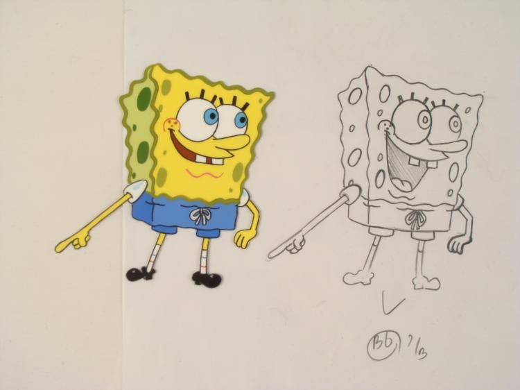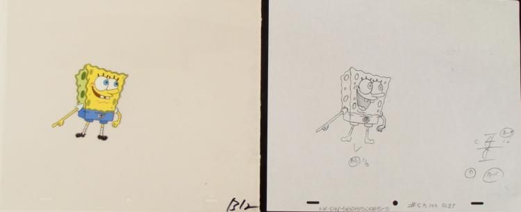 This is an original hand-painted animation cel with closely matching drawing from the Nickelodeon TV show SpongeBob Squarepants. The story takes place under the deep blue sea in Bikini Bottom, where SpongeBob resides. SpongeBob, who is a yellow, porous sponge, is your typical happy-go-lucky character, as he is always cheerful and enjoys making people laugh. Patrick Star, SpongeBob's neighbor who is a starfish, boasts knowing nothing and is often getting himself into ridiculous situations. Between the homes of these two lies the home of the miserable Squidward, a squid, who is known for being grouchy and playing tricks on SpongeBob and Patrick. Both SpongeBob and Squidward work at the Krusty Krab, a fast food business run by the greedy money-loving Mr. Krabs, a crab, the arch rival of the evil, possibly misunderstood, Plankton. Another neighbor, Sandy Cheeks, an athletic squirrel who normally wears an astronaut's space suit, was introduced in "Tea at the Treedome." She spends most of her time inventing and experimenting. * SpongeBob is pointing at something here--look look! * * Overall Size of cel and drawing: 10 1/2" x 12 1/2" Very good conditionEach one-of-a-kind set-up represents a slight change in position of the characters. When individually photographed and projected in rapid succession, the images appear to move. * To create production cels, the original animator's drawing is transferred onto an acetate cel (by hand-inking and/or photo copying). The cel is then hand-painted on the reverse side. * This is a double layer cel, with SpongeBob on one sheet, and Plankton on the other. The bottom of the sheets have peg holes, and the animator's notations. *