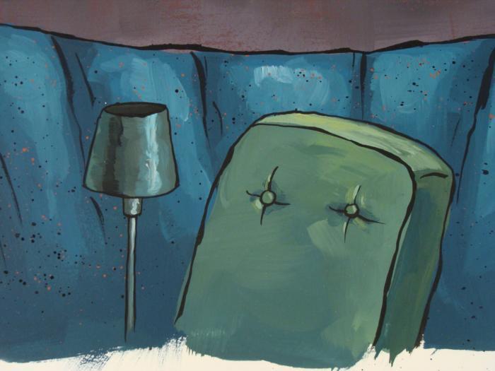 This original hand-painted background from the Nickelodeon TV show SpongeBob Squarepants. The story takes place under the deep blue sea in Bikini Bottom, where SpongeBob resides. SpongeBob, who is a yellow, porous sponge, is your typical happy-go-lucky character, as he is always cheerful and enjoys making people laugh. Patrick Star, SpongeBob's neighbor who is a starfish, is your average children's show idiot, as he boasts knowing nothing and is often getting himself into ridiculous situations. Between the homes of these two lies the home of the miserable Squidward, a squid, who is known for being grouchy and playing tricks on SpongeBob and Patrick. Both SpongeBob and Squidward work at the Krusty Krab, a fast food business run by the greedy money-loving Mr. Krabs, a crab, the arch rival of the evil, possibly misunderstood, Plankton. Another neighbor, Sandy Cheeks, an athletic squirrel who normally wears an astronaut's space suit, was introduced in "Tea at the Treedome." She spends most of her time inventing and experimenting. Who lives under a rock under the sea?Original Production Background Overall Size of Background: 10 1/2" x 14" Very good conditionOriginal Production Backgrounds are used in the making of the final version of animated productions. The background establishes the location and the overall good mood of the scenee. Typically, a background layout artist creates a drawing to establish the content of the scene, placement of characters, perspective and camera angle. Based on this drawing, the background artist creates a preliminary painting to confirm all of the scenes details, then the final production background which is used in the filming of the scene. When these backgrounds are individually photographed behind the progression of production cels, and projected at a rapid succession, the images in the foreground appear to move, creating an animated scene. The background is ready to be matted and framed. It is a colored background with the animator's notations at the bottom.