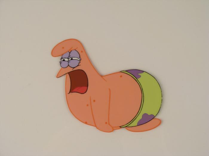 This original animation cel is from the Nickelodeon TV show SpongeBob Squarepants. The story takes place under the deep blue sea in Bikini Bottom, where SpongeBob resides. SpongeBob, who is a yellow, porous sponge, is your typical happy-go-lucky character, as he is always cheerful and enjoys making people laugh. Patrick Star, SpongeBob's Starfish neighbor, boasts knowing nothing and is often getting himself into ridiculous situations. Between the homes of these two lies the home of the miserable Squidward, a squid, who is known for being grouchy and playing tricks on SpongeBob and Patrick. Both SpongeBob and Squidward work at the Krusty Krab, a fast food business run by the greedy money-loving Mr. Krabs, a crab, the arch rival of the evil, possibly misunderstood, Plankton. Another neighbor, Sandy Cheeks, an athletic squirrel who normally wears an astronaut's space suit, was introduced in "Tea at the Treedome." She spends most of her time inventing and experimenting. In this cel Patrick has broken down crying. Original Production Animated Cel Overall Size of Cel: 10 1/2" x 12 1/2" Excellent Condition; slight outline wearEach one-of-a-kind set-up represents a slight change in position of the characters. When individually photographed and projected in rapid succession, the images appear to move.