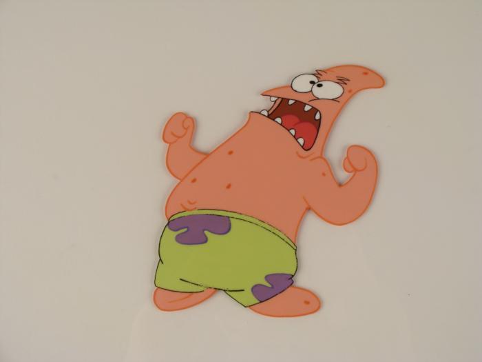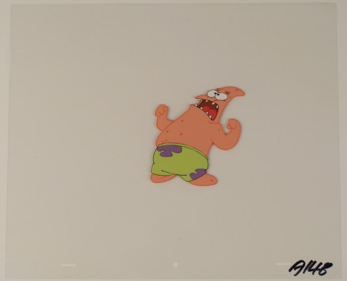 This original animation cel is from the Nickelodeon TV show SpongeBob Squarepants. The story takes place under the deep blue sea in Bikini Bottom, where SpongeBob resides. SpongeBob, who is a yellow, porous sponge, is your typical happy-go-lucky character, as he is always cheerful and enjoys making people laugh. Patrick Star, SpongeBob's Starfish neighbor, boasts knowing nothing and is often getting himself into ridiculous situations. Between the homes of these two lies the home of the miserable Squidward, a squid, who is known for being grouchy and playing tricks on SpongeBob and Patrick. Both SpongeBob and Squidward work at the Krusty Krab, a fast food business run by the greedy money-loving Mr. Krabs, a crab, the arch rival of the evil, possibly misunderstood, Plankton. Another neighbor, Sandy Cheeks, an athletic squirrel who normally wears an astronaut's space suit, was introduced in "Tea at the Treedome." She spends most of her time inventing and experimenting. In this cel Patrick looks like he's turning into the Incredible Hulk! Original Production Animated Cel Overall Size of Cel: 10 1/2" x 12 1/2" Excellent Condition; slight outline wearEach one-of-a-kind set-up represents a slight change in position of the characters. When individually photographed and projected in rapid succession, the images appear to move.