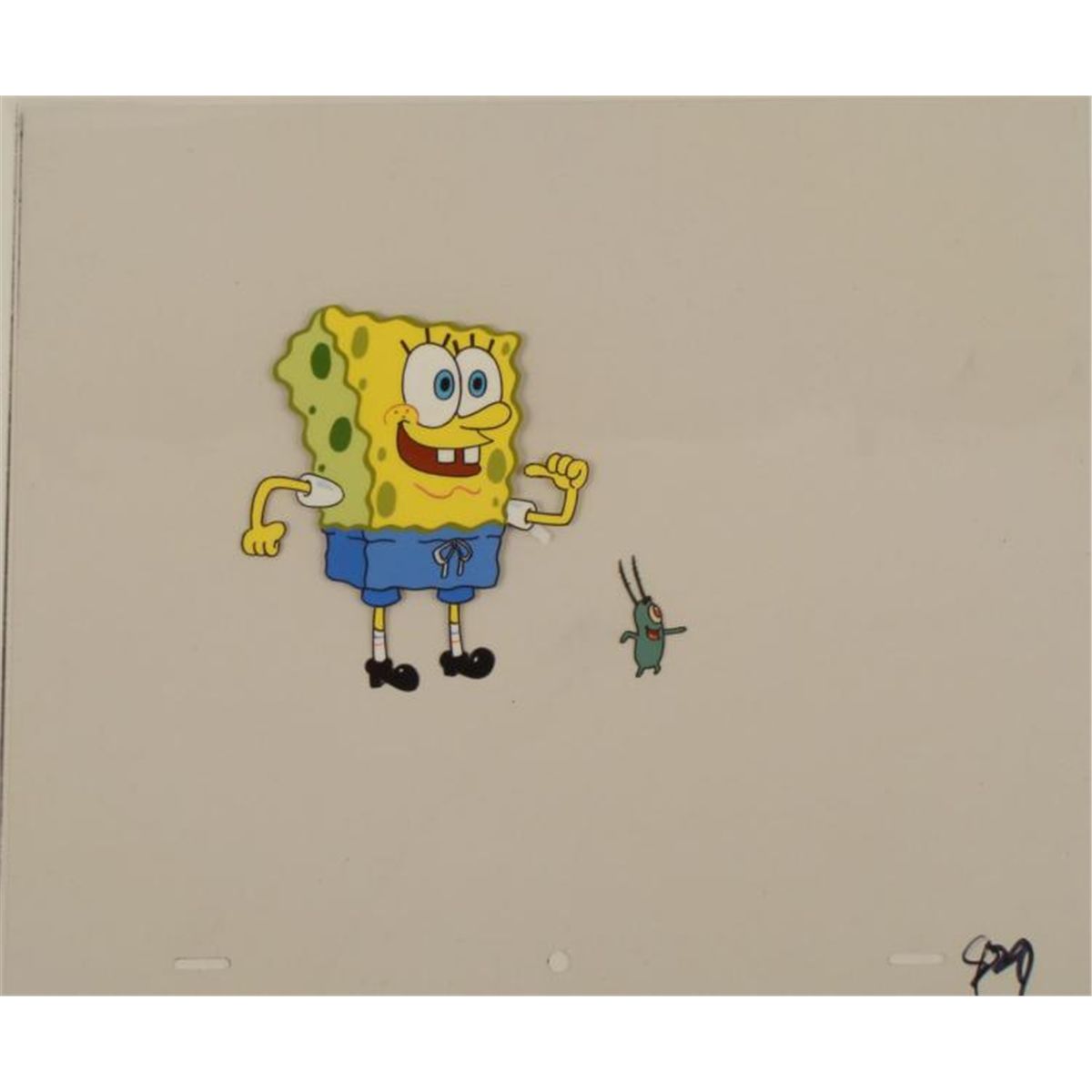 This original animation cel is from the Nickelodeon TV show SpongeBob Squarepants. The story takes place under the deep blue sea in Bikini Bottom, where SpongeBob resides. SpongeBob, who is a yellow, porous sponge, is your typical happy-go-lucky character, as he is always cheerful and enjoys making people laugh. Patrick Star, SpongeBob's neighbor who is a starfish, boasts knowing nothing and is often getting himself into ridiculous situations. Between the homes of these two lies the home of the miserable Squidward, a squid, who is known for being grouchy and playing tricks on SpongeBob and Patrick. Both SpongeBob and Squidward work at the Krusty Krab, a fast food business run by the greedy money-loving Mr. Krabs, a crab, the arch rival of the evil, possibly misunderstood, Plankton. Another neighbor, Sandy Cheeks, an athletic squirrel who normally wears an astronaut's space suit, was introduced in "Tea at the Treedome." She spends most of her time inventing and experimenting. * Plankton looks happy as SpongeBob seems to say "For me?" * Original Production Animated Cel Overall Size of Cel: 10 1/2" x 12 1/2" Very Good Condition (slight fading to outlines)This is an original hand-painted cel set-up used in the production of an episode of "SpongeBob SquarePants." Each one-of-a-kind set-up represents a slight change in position of the characters. When individually photographed and projected in rapid succession, the images appear to move. * To create production cels, the original animator's drawing is transferred onto an acetate cel (by hand-inking and/or photo copying). The cel is then hand-painted on the reverse side. * This is a double layer cel, with each character on a separate sheet. Peg holes and animator's notations are at the bottom of the cel. *