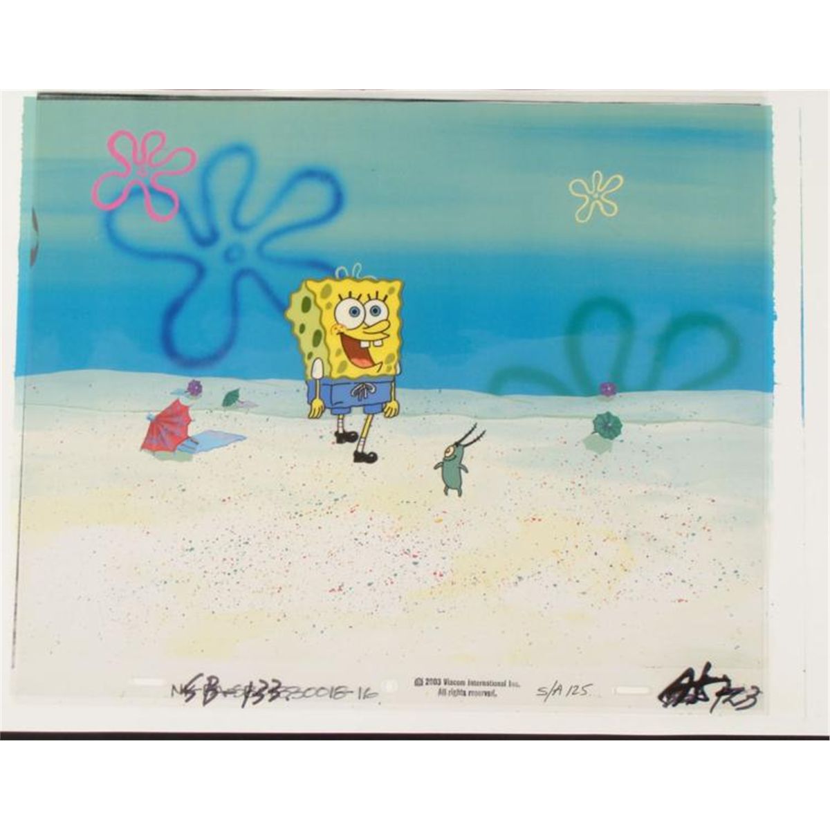 This is an original hand-painted 2 layer animation cel with printed background from the Nickelodeon TV show SpongeBob Squarepants. The story takes place under the deep blue sea in Bikini Bottom, where SpongeBob resides. SpongeBob, who is a yellow, porous sponge, is your typical happy-go-lucky character, as he is always cheerful and enjoys making people laugh. Patrick Star, SpongeBob's neighbor who is a starfish, boasts knowing nothing and is often getting himself into ridiculous situations. Between the homes of these two lies the home of the miserable Squidward, a squid, who is known for being grouchy and playing tricks on SpongeBob and Patrick. Both SpongeBob and Squidward work at the Krusty Krab, a fast food business run by the greedy money-loving Mr. Krabs, a crab, the arch rival of the evil, possibly misunderstood, Plankton. Another neighbor, Sandy Cheeks, an athletic squirrel who normally wears an astronaut's space suit, was introduced in "Tea at the Treedome." She spends most of her time inventing and experimenting. * Plankton is up to something, and SpongeBob looks like he's ready to go along with it. * * Overall Size of cel: 10 1/2" x 12 1/2" Overall Size of background 11" x 17"Very good conditionEach one-of-a-kind set-up represents a slight change in position of the characters. When individually photographed and projected in rapid succession, the images appear to move. * To create production cels, the original animator's drawing is transferred onto an acetate cel (by hand-inking and/or photo copying). The cel is then hand-painted on the reverse side. * This is a double layer cel, with SpongeBob on one sheet, and Plankton on the other. The bottom of the sheets have peg holes, and the animator's notations. *