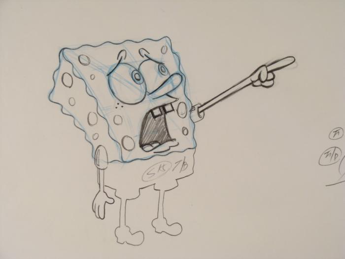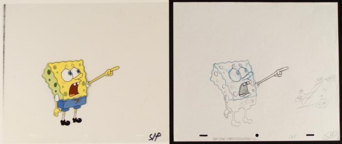 This original animation cel with accompanying drawing is from the Nickelodeon TV show SpongeBob Squarepants. The story takes place under the deep blue sea in Bikini Bottom, where SpongeBob resides. SpongeBob, who is a yellow, porous sponge, is your typical happy-go-lucky character, as he is always cheerful and enjoys making people laugh. Patrick Star, SpongeBob's neighbor who is a starfish, as he boasts knowing nothing and is often getting himself into ridiculous situations. Between the homes of these two lies the home of the miserable Squidward, a squid, who is known for being grouchy and playing tricks on SpongeBob and Patrick. Both SpongeBob and Squidward work at the Krusty Krab, a fast food business run by the greedy money-loving Mr. Krabs, a crab, the arch rival of the evil, possibly misunderstood, Plankton. Another neighbor, Sandy Cheeks, an athletic squirrel who normally wears an astronaut's space suit, was introduced in "Tea at the Treedome." She spends most of her time inventing and experimenting. In this cel and drawing sketch, SpongeBob is pointing, and looking very worried. Original Production Animated Cel Overall Size of Cel: 10 1/2" x 12 1/2" Excellent Condition; minor outline wearDrawing in graphite and non-photo blue pencil, showing outlines and animator notations.This is an original hand-painted cel set-up used in the production of an episode of "SpongeBob SquarePants." Each one-of-a-kind set-up represents a slight change in position of the characters. When individually photographed and projected in rapid succession, the images appear to move.