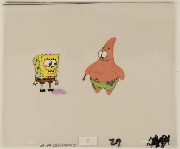 To create production cels, the original animator's drawing is transferred onto an acetate cel (by hand-inking and/or photo copying). The cel is then hand-painted on the reverse side. The cel is ready to be matted and framed. The animator's notations are at the bottom of the cel. There is some slight paint fade to SpongeBob's and Patrick's outlines. The cel has multiple layers; first is the clam, the second cel is SpongeBob, the third cel is Patrick's eyes, and the last cel is Patrick's body.