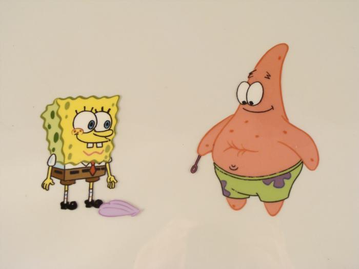 This original animation cel is from the Nickelodeon TV show SpongeBob Squarepants. The story takes place under the deep blue sea in Bikini Bottom, where SpongeBob resides. SpongeBob, who is a yellow, porous sponge, is your typical happy-go-lucky character, as he is always cheerful and enjoys making people laugh. Patrick Star, SpongeBob's neighbor who is a starfish, is your average children's show idiot, as he boasts knowing nothing and is often getting himself into ridiculous situations. Between the homes of these two lies the home of the miserable Squidward, a squid, who is known for being grouchy and playing tricks on SpongeBob and Patrick. Both SpongeBob and Squidward work at the Krusty Krab, a fast food business run by the greedy money-loving Mr. Krabs, a crab, the arch rival of the evil, possibly misunderstood, Plankton. Another neighbor, Sandy Cheeks, an athletic squirrel who normally wears an astronaut's space suit, was introduced in "Tea at the Treedome." She spends most of her time inventing and experimenting.Why is there a clam on the ground? Original Production Animated Cel Overall Size of Cel: 10 1/2" x 12 1/2" Very Good ConditionThis is an original hand-painted cel set-up used in the production of an episode of "SpongeBob SquarePants." Each one-of-a-kind set-up represents a slight change in position of the characters. When individually photographed and projected in rapid succession, the images appear to move.