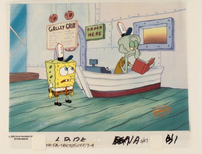 This animation cel and reproduction background are from the Nickelodeon TV show SpongeBob Squarepants. The story takes place under the deep blue sea in Bikini Bottom, where SpongeBob resides. SpongeBob, who is a yellow, porous sponge, is your typical happy-go-lucky character, as he is always cheerful and enjoys making people laugh. Patrick Star, SpongeBob's neighbor who is a starfish, is your average children's show idiot, as he boasts knowing nothing and is often getting himself into ridiculous situations. Between the homes of these two lies the home of the miserable Squidward, a squid, who is known for being grouchy and playing tricks on SpongeBob and Patrick. Both SpongeBob and Squidward work at the Krusty Krab, a fast food business run by the greedy money-loving Mr. Krabs, a crab, the arch rival of the evil, possibly misunderstood, Plankton. Another neighbor, Sandy Cheeks, an athletic squirrel who normally wears an astronaut's space suit, was introduced in "Tea at the Treedome." She spends most of her time inventing and experimenting. Why is Squidward reading in the Krusty Krab.Original Printed Background and Animated Cel Overall Size of Background: 10 1/2" x 17" Overall Size of the Cel: 10 1/2" x 12 1/2" Very good condition This is an original hand-painted cel set-up used in the production of an episode of "SpongeBob SquarePants." Each one-of-a-kind set-up represents a slight change in position of the characters. When individually photographed and projected in rapid succession, the images appear to move.