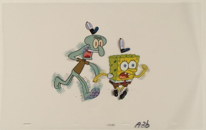 This original animation cel is from the Nickelodeon TV show SpongeBob Squarepants. The story takes place under the deep blue sea in Bikini Bottom, where SpongeBob resides. SpongeBob, who is a yellow, porous sponge, is your typical happy-go-lucky character, as he is always cheerful and enjoys making people laugh. Patrick Star, SpongeBob's neighbor who is a starfish, is your average children's show idiot, as he boasts knowing nothing and is often getting himself into ridiculous situations. Between the homes of these two lies the home of the miserable Squidward, a squid, who is known for being grouchy and playing tricks on SpongeBob and Patrick. Both SpongeBob and Squidward work at the Krusty Krab, a fast food business run by the greedy money-loving Mr. Krabs, a crab, the arch rival of the evil, possibly misunderstood, Plankton. Another neighbor, Sandy Cheeks, an athletic squirrel who normally wears an astronaut's space suit, was introduced in "Tea at the Treedome." She spends most of her time inventing and experimenting. Why are SpongeBob and Squidward running?Original Production Animated Cel Overall Size of Cel: 10 1/2" x 16 3/4" Very Good ConditionThis is an original hand-painted cel set-up used in the production of an episode of "SpongeBob SquarePants." Each one-of-a-kind set-up represents a slight change in position of the characters. When individually photographed and projected in rapid succession, the images appear to move.