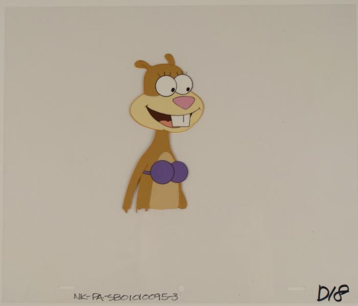 This original animation cel is from the Nickelodeon TV show SpongeBob Squarepants. The story takes place under the deep blue sea in Bikini Bottom, where SpongeBob resides. SpongeBob, who is a yellow, porous sponge, is your typical happy-go-lucky character, as he is always cheerful and enjoys making people laugh. Patrick Star, SpongeBob's Starfish neighbor, boasts knowing nothing and is often getting himself into ridiculous situations. Between the homes of these two lies the home of the miserable Squidward, a squid, who is known for being grouchy and playing tricks on SpongeBob and Patrick. Both SpongeBob and Squidward work at the Krusty Krab, a fast food business run by the greedy money-loving Mr. Krabs, a crab, the arch rival of the evil, possibly misunderstood, Plankton. Another neighbor, Sandy Cheeks, an athletic squirrel who normally wears an astronaut's space suit, was introduced in "Tea at the Treedome." She spends most of her time inventing and experimenting. In this cel Sandy Cheeks is smiling, showing her pearly whites. Original Production Animated Cel Overall Size of Cel: 10 1/2" x 12 1/2" Excellent Condition; slight outline wearEach one-of-a-kind set-up represents a slight change in position of the characters. When individually photographed and projected in rapid succession, the images appear to move.