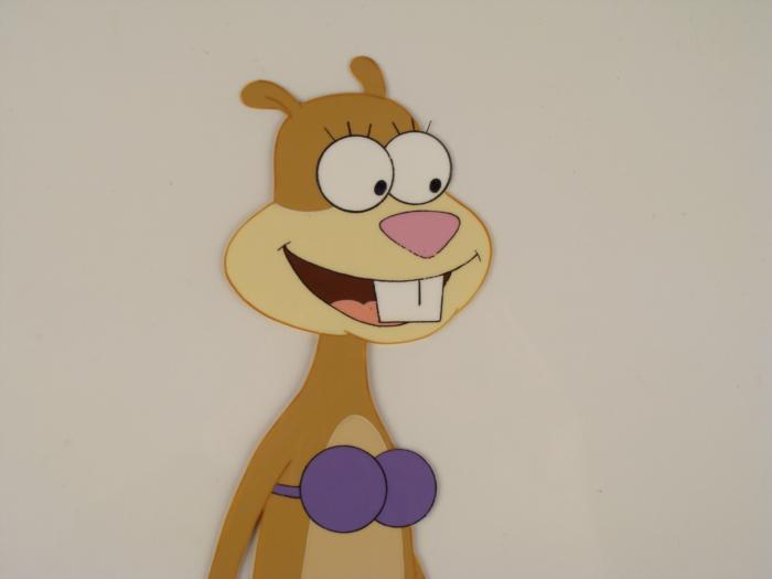 This original animation cel is from the Nickelodeon TV show SpongeBob Squarepants. The story takes place under the deep blue sea in Bikini Bottom, where SpongeBob resides. SpongeBob, who is a yellow, porous sponge, is your typical happy-go-lucky character, as he is always cheerful and enjoys making people laugh. Patrick Star, SpongeBob's Starfish neighbor, boasts knowing nothing and is often getting himself into ridiculous situations. Between the homes of these two lies the home of the miserable Squidward, a squid, who is known for being grouchy and playing tricks on SpongeBob and Patrick. Both SpongeBob and Squidward work at the Krusty Krab, a fast food business run by the greedy money-loving Mr. Krabs, a crab, the arch rival of the evil, possibly misunderstood, Plankton. Another neighbor, Sandy Cheeks, an athletic squirrel who normally wears an astronaut's space suit, was introduced in "Tea at the Treedome." She spends most of her time inventing and experimenting. In this cel Sandy Cheeks is smiling, showing her pearly whites. Original Production Animated Cel Overall Size of Cel: 10 1/2" x 12 1/2" Excellent Condition; slight outline wearEach one-of-a-kind set-up represents a slight change in position of the characters. When individually photographed and projected in rapid succession, the images appear to move.