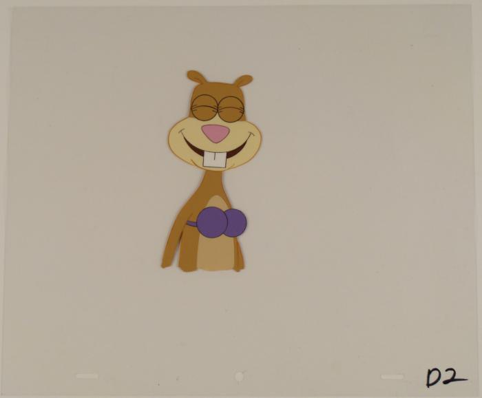 This original animation cel is from the Nickelodeon TV show SpongeBob Squarepants. The story takes place under the deep blue sea in Bikini Bottom, where SpongeBob resides. SpongeBob, who is a yellow, porous sponge, is your typical happy-go-lucky character, as he is always cheerful and enjoys making people laugh. Patrick Star, SpongeBob's Starfish neighbor, boasts knowing nothing and is often getting himself into ridiculous situations. Between the homes of these two lies the home of the miserable Squidward, a squid, who is known for being grouchy and playing tricks on SpongeBob and Patrick. Both SpongeBob and Squidward work at the Krusty Krab, a fast food business run by the greedy money-loving Mr. Krabs, a crab, the arch rival of the evil, possibly misunderstood, Plankton. Another neighbor, Sandy Cheeks, an athletic squirrel who normally wears an astronaut's space suit, was introduced in "Tea at the Treedome." She spends most of her time inventing and experimenting. In this cel Sandy Cheeks is having a good laugh. Original Production Animated Cel Overall Size of Cel: 10 1/2" x 12 1/2" Excellent Condition; slight outline wearEach one-of-a-kind set-up represents a slight change in position of the characters. When individually photographed and projected in rapid succession, the images appear to move.