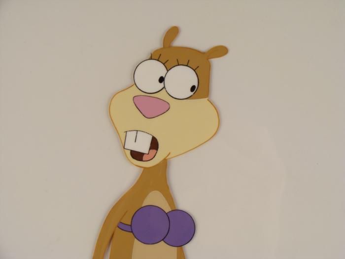 This original animation cel is from the Nickelodeon TV show SpongeBob Squarepants. The story takes place under the deep blue sea in Bikini Bottom, where SpongeBob resides. SpongeBob, who is a yellow, porous sponge, is your typical happy-go-lucky character, as he is always cheerful and enjoys making people laugh. Patrick Star, SpongeBob's Starfish neighbor, boasts knowing nothing and is often getting himself into ridiculous situations. Between the homes of these two lies the home of the miserable Squidward, a squid, who is known for being grouchy and playing tricks on SpongeBob and Patrick. Both SpongeBob and Squidward work at the Krusty Krab, a fast food business run by the greedy money-loving Mr. Krabs, a crab, the arch rival of the evil, possibly misunderstood, Plankton. Another neighbor, Sandy Cheeks, an athletic squirrel who normally wears an astronaut's space suit, was introduced in "Tea at the Treedome." She spends most of her time inventing and experimenting. In this cel Sandy Cheeks looks a bit surprised. Original Production Animated Cel Overall Size of Cel: 10 1/2" x 12 1/2" Excellent Condition; slight outline wearEach one-of-a-kind set-up represents a slight change in position of the characters. When individually photographed and projected in rapid succession, the images appear to move.