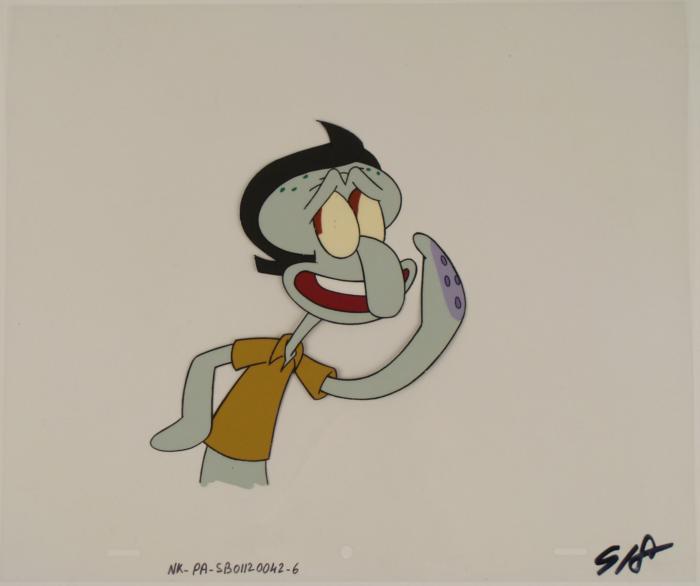 This original animation cel is from the Nickelodeon TV show SpongeBob Squarepants. The story takes place under the deep blue sea in Bikini Bottom, where SpongeBob resides. SpongeBob, who is a yellow, porous sponge, is your typical happy-go-lucky character, as he is always cheerful and enjoys making people laugh. Patrick Star, SpongeBob's Starfish neighbor, boasts knowing nothing and is often getting himself into ridiculous situations. Between the homes of these two lies the home of the miserable Squidward, a squid, who is known for being grouchy and playing tricks on SpongeBob and Patrick. Both SpongeBob and Squidward work at the Krusty Krab, a fast food business run by the greedy money-loving Mr. Krabs, a crab, the arch rival of the evil, possibly misunderstood, Plankton. Another neighbor, Sandy Cheeks, an athletic squirrel who normally wears an astronaut's space suit, was introduced in "Tea at the Treedome." She spends most of her time inventing and experimenting. In this cel Squidward is looking cool is in cool doo. Original Production Animated Cel Overall Size of Cel: 10 1/2" x 12 1/2" Excellent ConditionEach one-of-a-kind set-up represents a slight change in position of the characters. When individually photographed and projected in rapid succession, the images appear to move.