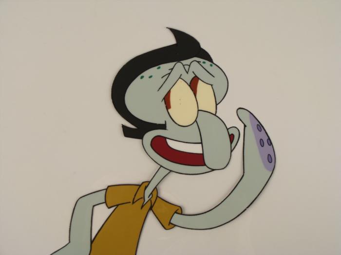 This original animation cel is from the Nickelodeon TV show SpongeBob Squarepants. The story takes place under the deep blue sea in Bikini Bottom, where SpongeBob resides. SpongeBob, who is a yellow, porous sponge, is your typical happy-go-lucky character, as he is always cheerful and enjoys making people laugh. Patrick Star, SpongeBob's Starfish neighbor, boasts knowing nothing and is often getting himself into ridiculous situations. Between the homes of these two lies the home of the miserable Squidward, a squid, who is known for being grouchy and playing tricks on SpongeBob and Patrick. Both SpongeBob and Squidward work at the Krusty Krab, a fast food business run by the greedy money-loving Mr. Krabs, a crab, the arch rival of the evil, possibly misunderstood, Plankton. Another neighbor, Sandy Cheeks, an athletic squirrel who normally wears an astronaut's space suit, was introduced in "Tea at the Treedome." She spends most of her time inventing and experimenting. In this cel Squidward is looking cool is in cool doo. Original Production Animated Cel Overall Size of Cel: 10 1/2" x 12 1/2" Excellent ConditionEach one-of-a-kind set-up represents a slight change in position of the characters. When individually photographed and projected in rapid succession, the images appear to move.