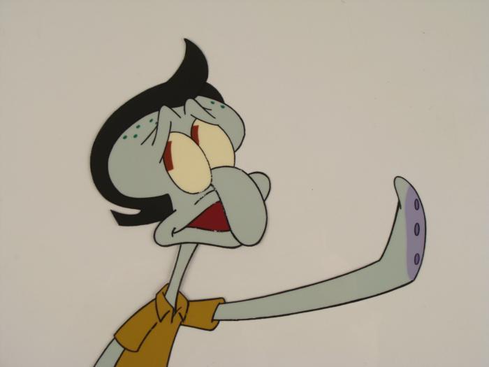 This original animation cel is from the Nickelodeon TV show SpongeBob Squarepants. The story takes place under the deep blue sea in Bikini Bottom, where SpongeBob resides. SpongeBob, who is a yellow, porous sponge, is your typical happy-go-lucky character, as he is always cheerful and enjoys making people laugh. Patrick Star, SpongeBob's Starfish neighbor, boasts knowing nothing and is often getting himself into ridiculous situations. Between the homes of these two lies the home of the miserable Squidward, a squid, who is known for being grouchy and playing tricks on SpongeBob and Patrick. Both SpongeBob and Squidward work at the Krusty Krab, a fast food business run by the greedy money-loving Mr. Krabs, a crab, the arch rival of the evil, possibly misunderstood, Plankton. Another neighbor, Sandy Cheeks, an athletic squirrel who normally wears an astronaut's space suit, was introduced in "Tea at the Treedome." She spends most of her time inventing and experimenting. In this cel Squidward looks like he's just too cool for all that! Original Production Animated Cel Overall Size of Cel: 10 1/2" x 12 1/2" Excellent Condition; slight outline wearEach one-of-a-kind set-up represents a slight change in position of the characters. When individually photographed and projected in rapid succession, the images appear to move.