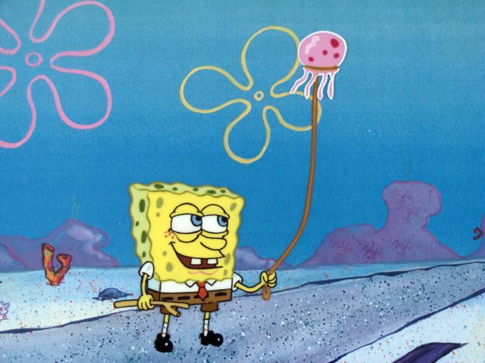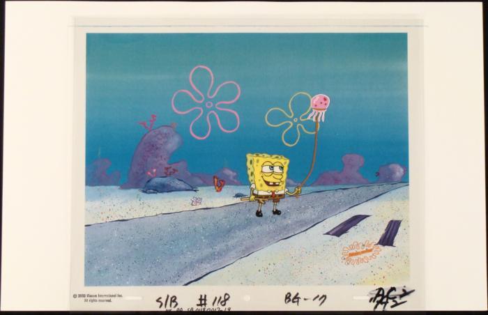 To create production cels, the original animator's drawing is transferred onto an acetate cel (by hand-inking and/or photo copying). The cel is then hand-painted on the reverse side. The printed background is ready to be matted and framed. It is a colored background with a cel and has the animator's notations at the bottom of the background and the cel. The background is a printed reproduction background. There is a Nickelodeon TV logo on the bottom right of the cel. The cel has multiple layers; first is the jellyfish and the second cel is SpongeBob
