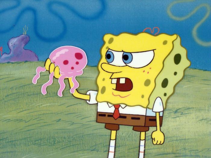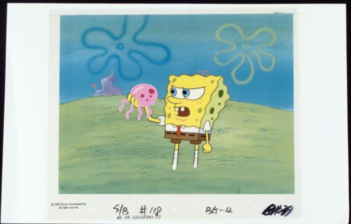 This animation cel and reproduction background are from the Nickelodeon TV show SpongeBob Squarepants. The story takes place under the deep blue sea in Bikini Bottom, where SpongeBob resides. SpongeBob, who is a yellow, porous sponge, is your typical happy-go-lucky character, as he is always cheerful and enjoys making people laugh. Patrick Star, SpongeBob's neighbor who is a starfish, is your average children's show idiot, as he boasts knowing nothing and is often getting himself into ridiculous situations. Between the homes of these two lies the home of the miserable Squidward, a squid, who is known for being grouchy and playing tricks on SpongeBob and Patrick. Both SpongeBob and Squidward work at the Krusty Krab, a fast food business run by the greedy money-loving Mr. Krabs, a crab, the arch rival of the evil, possibly misunderstood, Plankton. Another neighbor, Sandy Cheeks, an athletic squirrel who normally wears an astronaut's space suit, was introduced in "Tea at the Treedome." She spends most of her time inventing and experimenting. How is the jellyfish not stinging SpongeBob?Original Printed Background and Animated Cel Overall Size of Background: 11" x 17" Overall Size of the Cel: 10 1/2" x 12 1/2" Very good condition This is an original hand-painted cel set-up used in the production of an episode of "SpongeBob SquarePants." Each one-of-a-kind set-up represents a slight change in position of the characters. When individually photographed and projected in rapid succession, the images appear to move.