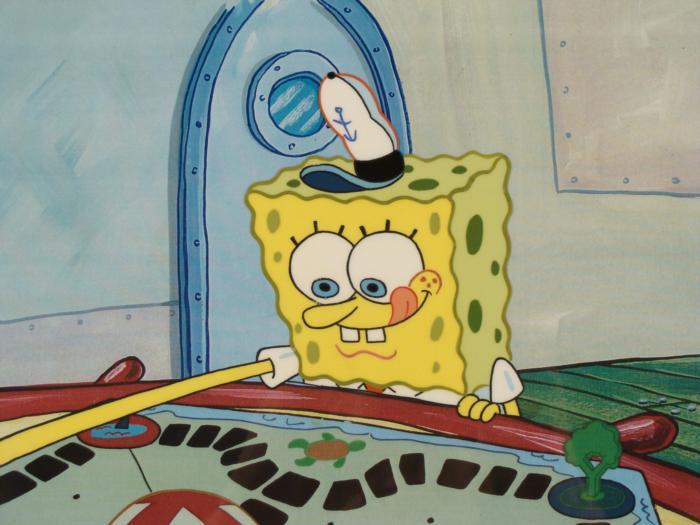 This animation cel and reproduction background are from the Nickelodeon TV show SpongeBob Squarepants. The story takes place under the deep blue sea in Bikini Bottom, where SpongeBob resides. SpongeBob, who is a yellow, porous sponge, is your typical happy-go-lucky character, as he is always cheerful and enjoys making people laugh. Patrick Star, SpongeBob's neighbor who is a starfish, is your average children's show idiot, as he boasts knowing nothing and is often getting himself into ridiculous situations. Between the homes of these two lies the home of the miserable Squidward, a squid, who is known for being grouchy and playing tricks on SpongeBob and Patrick. Both SpongeBob and Squidward work at the Krusty Krab, a fast food business run by the greedy money-loving Mr. Krabs, a crab, the arch rival of the evil, possibly misunderstood, Plankton. Another neighbor, Sandy Cheeks, an athletic squirrel who normally wears an astronaut's space suit, was introduced in "Tea at the Treedome." She spends most of her time inventing and experimenting. SpongeBob seems to be doing good in the game he is playing.Original Printed Background and Animated Cel Overall Size of Background: 11" x 17" Overall Size of the Cel: 10 1/2" x 12 1/2" Very good condition; it has been storedThis is an original hand-painted cel set-up used in the production of an episode of "SpongeBob SquarePants." Each one-of-a-kind set-up represents a slight change in position of the characters. When individually photographed and projected in rapid succession, the images appear to move.