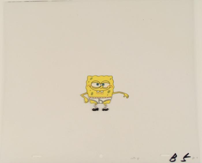 This original animation cel is from the Nickelodeon TV show SpongeBob Squarepants. The story takes place under the deep blue sea in Bikini Bottom, where SpongeBob resides. SpongeBob, who is a yellow, porous sponge, is your typical happy-go-lucky character, as he is always cheerful and enjoys making people laugh. Patrick Star, SpongeBob's Starfish neighbor, boasts knowing nothing and is often getting himself into ridiculous situations. Between the homes of these two lies the home of the miserable Squidward, a squid, who is known for being grouchy and playing tricks on SpongeBob and Patrick. Both SpongeBob and Squidward work at the Krusty Krab, a fast food business run by the greedy money-loving Mr. Krabs, a crab, the arch rival of the evil, possibly misunderstood, Plankton. Another neighbor, Sandy Cheeks, an athletic squirrel who normally wears an astronaut's space suit, was introduced in "Tea at the Treedome." She spends most of her time inventing and experimenting. In this cel a SpongeBob SquarePants looks more like SpongeBob UnderPants! Original Production Animated Cel Overall Size of Cel: 10 1/2" x 12 1/2" Excellent Condition; minor outline wearThis is an original hand-painted cel set-up used in the production of an episode of "SpongeBob SquarePants." Each one-of-a-kind set-up represents a slight change in position of the characters. When individually photographed and projected in rapid succession, the images appear to move.