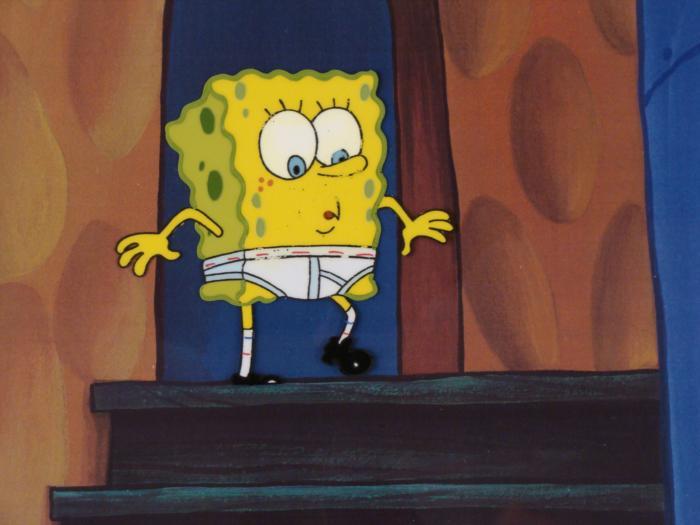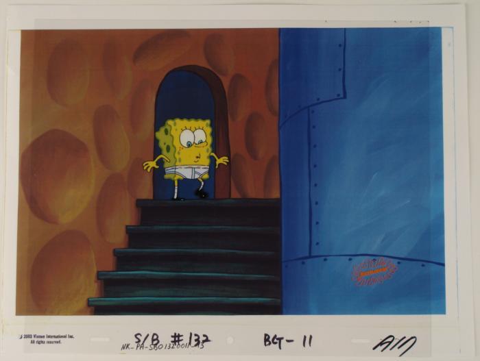 This original animation cel and printed background copy are from the Nickelodeon TV show SpongeBob Squarepants. The story takes place under the deep blue sea in Bikini Bottom, where SpongeBob resides. SpongeBob, who is a yellow, porous sponge, is your typical happy-go-lucky character, as he is always cheerful and enjoys making people laugh. Patrick Star, SpongeBob's Starfish neighbor, boasts knowing nothing and is often getting himself into ridiculous situations. Between the homes of these two lies the home of the miserable Squidward, a squid, who is known for being grouchy and playing tricks on SpongeBob and Patrick. Both SpongeBob and Squidward work at the Krusty Krab, a fast food business run by the greedy money-loving Mr. Krabs, a crab, the arch rival of the evil, possibly misunderstood, Plankton. Another neighbor, Sandy Cheeks, an athletic squirrel who normally wears an astronaut's space suit, was introduced in "Tea at the Treedome." She spends most of her time inventing and experimenting. In this cel SpongeBob stands at the top of a staircase in his underpants. Original Production Animated Cel Overall Size of Cel: 10 1/2" x 12 1/2" Excellent Condition; slight outline wearBackground: printed on paper, with 2003 Viacom copyright, lower leftBackground size: 11" x 14 1/2".Each one-of-a-kind set-up represents a slight change in position of the characters. When individually photographed and projected in rapid succession, the images appear to move.