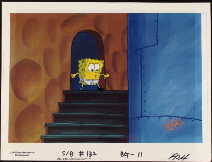This original animation cel and printed background copy are from the Nickelodeon TV show SpongeBob Squarepants. The story takes place under the deep blue sea in Bikini Bottom, where SpongeBob resides. SpongeBob, who is a yellow, porous sponge, is your typical happy-go-lucky character, as he is always cheerful and enjoys making people laugh. Patrick Star, SpongeBob's Starfish neighbor, boasts knowing nothing and is often getting himself into ridiculous situations. Between the homes of these two lies the home of the miserable Squidward, a squid, who is known for being grouchy and playing tricks on SpongeBob and Patrick. Both SpongeBob and Squidward work at the Krusty Krab, a fast food business run by the greedy money-loving Mr. Krabs, a crab, the arch rival of the evil, possibly misunderstood, Plankton. Another neighbor, Sandy Cheeks, an athletic squirrel who normally wears an astronaut's space suit, was introduced in "Tea at the Treedome." She spends most of her time inventing and experimenting. In this cel SpongeBob stands at the top of a staircase in his underwear. Original Production Animated Cel Overall Size of Cel: 10 1/2" x 12 1/2" Excellent Condition; slight outline wearBackground: printed on paper, with 2003 Viacom copyright, lower leftBackground size: 11" x 14 1/2".Each one-of-a-kind set-up represents a slight change in position of the characters. When individually photographed and projected in rapid succession, the images appear to move.