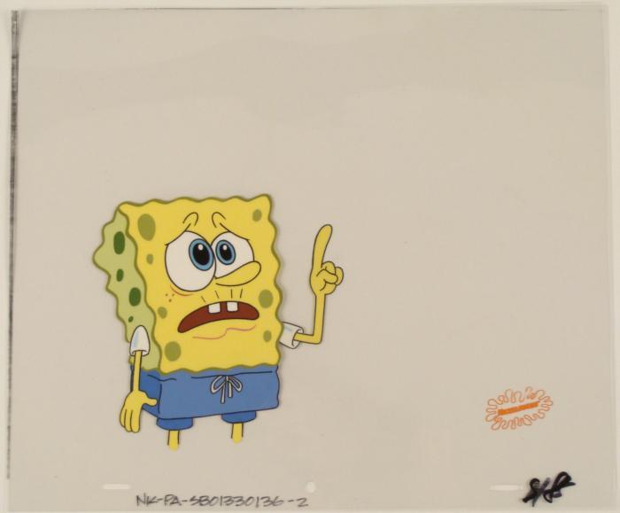 To create production cels, the original animator's drawing is transferred onto an acetate cel (by hand-inking and/or photo copying). The cel is then hand-painted on the reverse side. The cel is ready to be matted and framed. The animator's notations are at the bottom of the cel. There is some slight paint fade to SpongeBob's outline. There is a Nickelodeon logo on the bottom right of the cel. The cel has multiple layers; first is SpongeBob's body and the second cel is SpongeBob's arm.