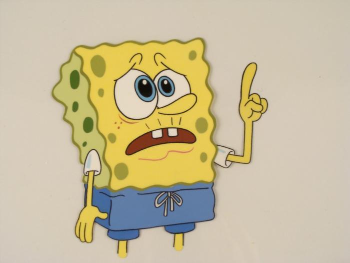 This original animation cel is from the Nickelodeon TV show SpongeBob Squarepants. The story takes place under the deep blue sea in Bikini Bottom, where SpongeBob resides. SpongeBob, who is a yellow, porous sponge, is your typical happy-go-lucky character, as he is always cheerful and enjoys making people laugh. Patrick Star, SpongeBob's neighbor who is a starfish, is your average children's show idiot, as he boasts knowing nothing and is often getting himself into ridiculous situations. Between the homes of these two lies the home of the miserable Squidward, a squid, who is known for being grouchy and playing tricks on SpongeBob and Patrick. Both SpongeBob and Squidward work at the Krusty Krab, a fast food business run by the greedy money-loving Mr. Krabs, a crab, the arch rival of the evil, possibly misunderstood, Plankton. Another neighbor, Sandy Cheeks, an athletic squirrel who normally wears an astronaut's space suit, was introduced in "Tea at the Treedome." She spends most of her time inventing and experimenting. "Wait One Second!"Original Production Animated Cel Overall Size of Cel: 10 1/2" x 12 1/2" Very Good ConditionThis is an original hand-painted cel set-up used in the production of an episode of "SpongeBob SquarePants." Each one-of-a-kind set-up represents a slight change in position of the characters. When individually photographed and projected in rapid succession, the images appear to move.