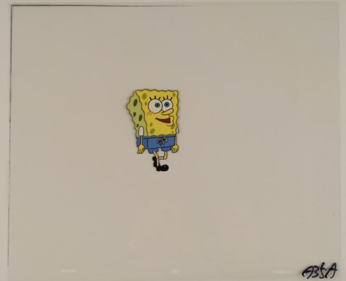 This original animation cel is from the Nickelodeon TV show SpongeBob Squarepants. The story takes place under the deep blue sea in Bikini Bottom, where SpongeBob resides. SpongeBob, who is a yellow, porous sponge, is your typical happy-go-lucky character, as he is always cheerful and enjoys making people laugh. Patrick Star, SpongeBob's Starfish neighbor, boasts knowing nothing and is often getting himself into ridiculous situations. Between the homes of these two lies the home of the miserable Squidward, a squid, who is known for being grouchy and playing tricks on SpongeBob and Patrick. Both SpongeBob and Squidward work at the Krusty Krab, a fast food business run by the greedy money-loving Mr. Krabs, a crab, the arch rival of the evil, possibly misunderstood, Plankton. Another neighbor, Sandy Cheeks, an athletic squirrel who normally wears an astronaut's space suit, was introduced in "Tea at the Treedome." She spends most of her time inventing and experimenting. In this cel SpongeBob is walking along in his swim trunks and talking. Original Production Animated Cel Overall Size of Cel: 10 1/2" x 12 1/2" Excellent Condition; slight outline wearEach one-of-a-kind set-up represents a slight change in position of the characters. When individually photographed and projected in rapid succession, the images appear to move.