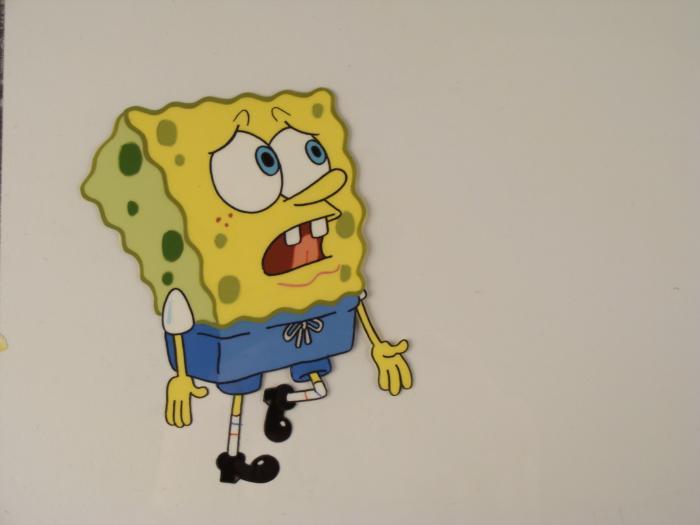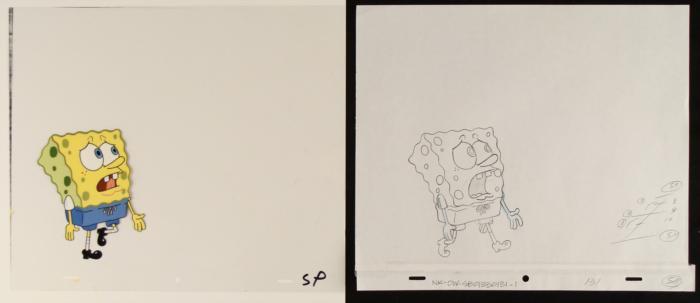 This original animation cel with accompanying drawing is from the Nickelodeon TV show SpongeBob Squarepants. The story takes place under the deep blue sea in Bikini Bottom, where SpongeBob resides. SpongeBob, who is a yellow, porous sponge, is your typical happy-go-lucky character, as he is always cheerful and enjoys making people laugh. Patrick Star, SpongeBob's neighbor who is a starfish, as he boasts knowing nothing and is often getting himself into ridiculous situations. Between the homes of these two lies the home of the miserable Squidward, a squid, who is known for being grouchy and playing tricks on SpongeBob and Patrick. Both SpongeBob and Squidward work at the Krusty Krab, a fast food business run by the greedy money-loving Mr. Krabs, a crab, the arch rival of the evil, possibly misunderstood, Plankton. Another neighbor, Sandy Cheeks, an athletic squirrel who normally wears an astronaut's space suit, was introduced in "Tea at the Treedome." She spends most of her time inventing and experimenting. In this cel and drawing sketch, SpongeBob is gazing at something, and looking very worried. Original Production Animated Cel Overall Size of Cel: 10 1/2" x 12 1/2" Excellent Condition; minor outline wearDrawing in graphite and non-photo blue pencil, showing animator notations; bottom edge portion has been cut and taped back onThis is an original hand-painted cel set-up used in the production of an episode of "SpongeBob SquarePants." Each one-of-a-kind set-up represents a slight change in position of the characters. When individually photographed and projected in rapid succession, the images appear to move.