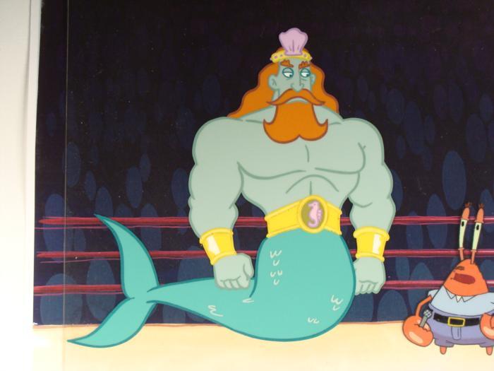 This original animation cel is from the Nickelodeon TV show SpongeBob Squarepants. The story takes place under the deep blue sea in Bikini Bottom, where SpongeBob resides. SpongeBob, who is a yellow, porous sponge, is your typical happy-go-lucky character, as he is always cheerful and enjoys making people laugh.Patrick Star, SpongeBob's neighbor is a starfish, and he boasts knowing nothing and is often getting himself into ridiculous situations. Between the homes of these two lies the home of the miserable Squidward, a squid, who is known for being grouchy and playing tricks on SpongeBob and Patrick. Both SpongeBob and Squidward work at the Krusty Krab, a fast food business run by the greedy money-loving Mr. Krabs, a crab, the arch rival of the evil, possibly misunderstood, Plankton. Another neighbor, Sandy Cheeks, an athletic squirrel who normally wears an astronaut's space suit, was introduced in "Tea at the Treedome." She spends most of her time inventing and experimenting. In this cel, SpongeBob looks like he's ready to battle King Neptune in a wrestling match, while Mr. Krabs plays the announcer. Original Production Animated Cel Overall Size of Cel: 10 1/2" x 12 1/2" Excellent ConditionPrinted background copy, 11" x 17"To create production cels, the original animator's drawing is transferred onto an acetate cel (by hand-inking and/or photo copying). The cel is then hand-painted on the reverse side. The cel is ready to be matted and framed. Peg holes and animator's notations are at the bottom of the cel. This is multi-layered- each character is on a separate cel.