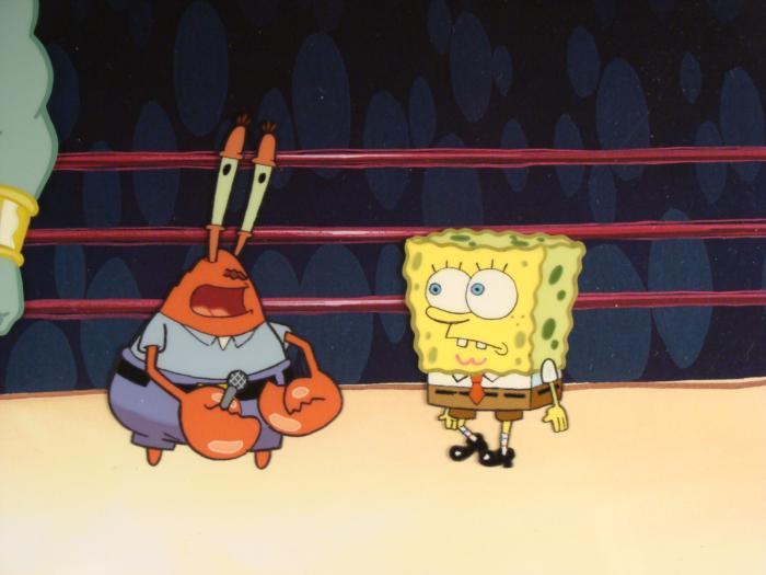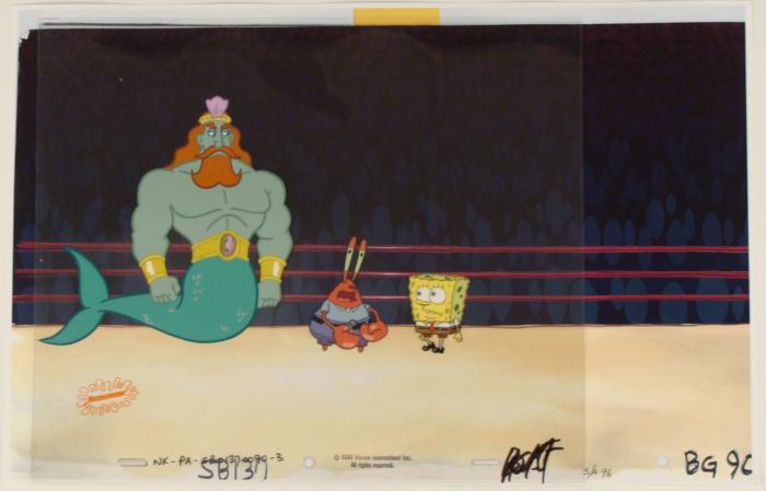 This original animation cel is from the Nickelodeon TV show SpongeBob Squarepants. The story takes place under the deep blue sea in Bikini Bottom, where SpongeBob resides. SpongeBob, who is a yellow, porous sponge, is your typical happy-go-lucky character, as he is always cheerful and enjoys making people laugh.Patrick Star, SpongeBob's neighbor is a starfish, and he boasts knowing nothing and is often getting himself into ridiculous situations. Between the homes of these two lies the home of the miserable Squidward, a squid, who is known for being grouchy and playing tricks on SpongeBob and Patrick. Both SpongeBob and Squidward work at the Krusty Krab, a fast food business run by the greedy money-loving Mr. Krabs, a crab, the arch rival of the evil, possibly misunderstood, Plankton. Another neighbor, Sandy Cheeks, an athletic squirrel who normally wears an astronaut's space suit, was introduced in "Tea at the Treedome." She spends most of her time inventing and experimenting. In this cel: SpongeBob versus King Neptune--the battle of the century! Mr. Krabs plays the announcer. Original Production Animated Cel Overall Size of Cel: 10 1/2" x 12 1/2" Excellent ConditionPrinted background copy, 11" x 17"To create production cels, the original animator's drawing is transferred onto an acetate cel (by hand-inking and/or photo copying). The cel is then hand-painted on the reverse side. The cel is ready to be matted and framed. Peg holes and animator's notations are at the bottom of the cel. This is multi-layered- each character is on a separate cel.