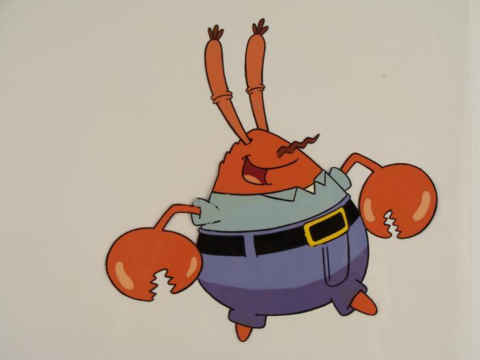 This original animation cel is from the Nickelodeon TV show SpongeBob Squarepants. The story takes place under the deep blue sea in Bikini Bottom, where SpongeBob resides. SpongeBob, who is a yellow, porous sponge, is your typical happy-go-lucky character, as he is always cheerful and enjoys making people laugh. Patrick Star, SpongeBob's neighbor who is a starfish, is your average children's show idiot, as he boasts knowing nothing and is often getting himself into ridiculous situations. Between the homes of these two lies the home of the miserable Squidward, a squid, who is known for being grouchy and playing tricks on SpongeBob and Patrick. Both SpongeBob and Squidward work at the Krusty Krab, a fast food business run by the greedy money-loving Mr. Krabs, a crab, the arch rival of the evil, possibly misunderstood, Plankton. Another neighbor, Sandy Cheeks, an athletic squirrel who normally wears an astronaut's space suit, was introduced in "Tea at the Treedome." She spends most of her time inventing and experimenting. Shown here is SpongeBob's pet, Gary the snail.Mr. Krabs must have pulled off one heck of stunt, he appears to have that evil laugh going for him.Original Production Animated Cel Overall Size of Cel: 10 1/2" x 12 1/2" Excellent ConditionThis is an original hand-painted cel set-up used in the production of an episode of "SpongeBob SquarePants." Each one-of-a-kind set-up represents a slight change in position of the characters. When individually photographed and projected in rapid succession, the images appear to move.