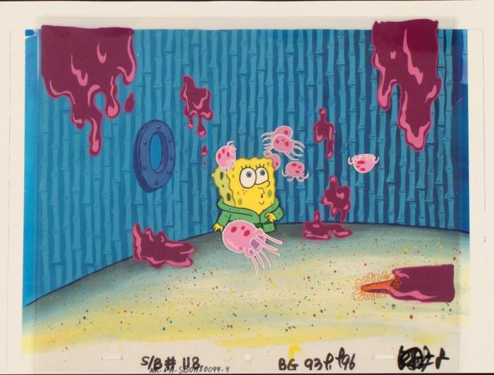 To create production cels, the original animator's drawing is transferred onto an acetate cel (by hand-inking and/or photo copying). The cel is then hand-painted on the reverse side. The background accompanying this set-up is a reproduction background. The background is ready to be matted and framed. It is a colored background with a cel and has the animator's notations at the bottom of both. The cel has multi-layers; first the three separate floating jellyfish, next is Spongebob, and then four grouped together jellyfish.