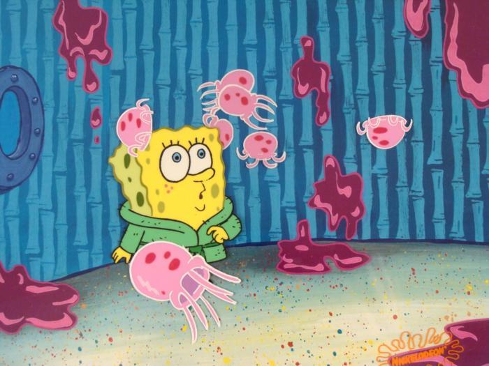 To create production cels, the original animator's drawing is transferred onto an acetate cel (by hand-inking and/or photo copying). The cel is then hand-painted on the reverse side. The background accompanying this set-up is a reproduction background. The background is ready to be matted and framed. It is a colored background with a cel and has the animator's notations at the bottom of both. The cel has multi-layers; first the three separate floating jellyfish, next is Spongebob, and then four grouped together jellyfish.