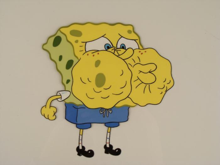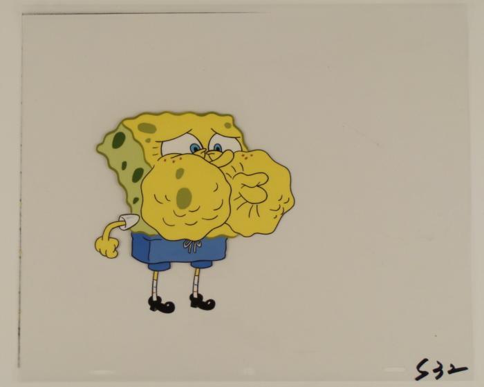 This original animation cel is from the Nickelodeon TV show SpongeBob Squarepants. The story takes place under the deep blue sea in Bikini Bottom, where SpongeBob resides. SpongeBob, who is a yellow, porous sponge, is your typical happy-go-lucky character, as he is always cheerful and enjoys making people laugh. Patrick Star, SpongeBob's neighbor who is a starfish, is your average children's show idiot, as he boasts knowing nothing and is often getting himself into ridiculous situations. Between the homes of these two lies the home of the miserable Squidward, a squid, who is known for being grouchy and playing tricks on SpongeBob and Patrick. Both SpongeBob and Squidward work at the Krusty Krab, a fast food business run by the greedy money-loving Mr. Krabs, a crab, the arch rival of the evil, possibly misunderstood, Plankton. Another neighbor, Sandy Cheeks, an athletic squirrel who normally wears an astronaut's space suit, was introduced in "Tea at the Treedome." She spends most of her time inventing and experimenting. Can Spongebob break the world record of holding one's breath?Original Production Animated Cel Overall Size of Cel: 10 1/2" x 12 1/2" Excellent ConditionThis is an original hand-painted cel set-up used in the production of an episode of "SpongeBob SquarePants." Each one-of-a-kind set-up represents a slight change in position of the characters. When individually photographed and projected in rapid succession, the images appear to move.