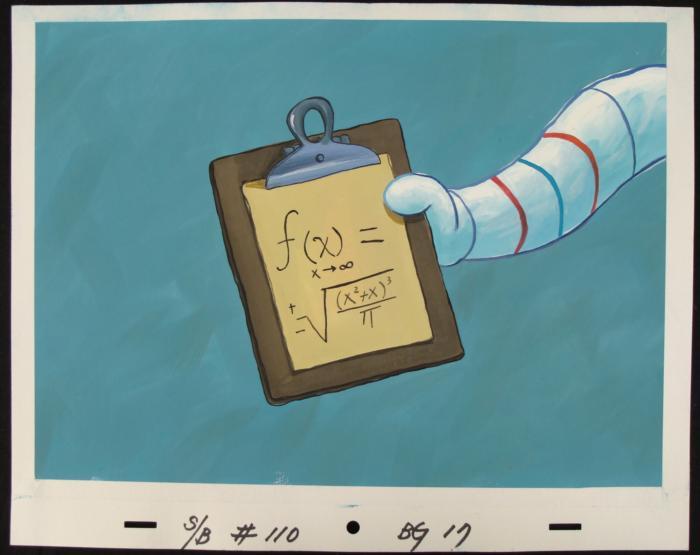 This original hand-painted background from the Nickelodeon TV show SpongeBob Squarepants. The story takes place under the deep blue sea in Bikini Bottom, where SpongeBob resides. SpongeBob, who is a yellow, porous sponge, is your typical happy-go-lucky character, as he is always cheerful and enjoys making people laugh. Patrick Star, SpongeBob's neighbor who is a starfish, is your average children's show idiot, as he boasts knowing nothing and is often getting himself into ridiculous situations. Between the homes of these two lies the home of the miserable Squidward, a squid, who is known for being grouchy and playing tricks on SpongeBob and Patrick. Both SpongeBob and Squidward work at the Krusty Krab, a fast food business run by the greedy money-loving Mr. Krabs, a crab, the arch rival of the evil, possibly misunderstood, Plankton. Another neighbor, Sandy Cheeks, an athletic squirrel who normally wears an astronaut's space suit, was introduced in "Tea at the Treedome." She spends most of her time inventing and experimenting. Sandy, the math whiz, is showing off her mad math skills. Original Production Background Overall Size of Background: 10 1/4" x 12 7/8" Very good condition; it has been stored Original Production Backgrounds are used in the making of the final version of animated productions. The background establishes the location and the overall good mood of the scenee. Typically, a background layout artist creates a drawing to establish the content of the scene, placement of characters, perspective and camera angle. Based on this drawing, the background artist creates a preliminary painting to confirm all of the scenes details, then the final production background which is used in the filming of the scene. When these backgrounds are individually photographed behind the progression of production cels, and projected at a rapid succession, the images in the foreground appear to move, creating an animated scene. The background is ready to be matted and framed. It is a colored background with the animator's notations at the bottom.