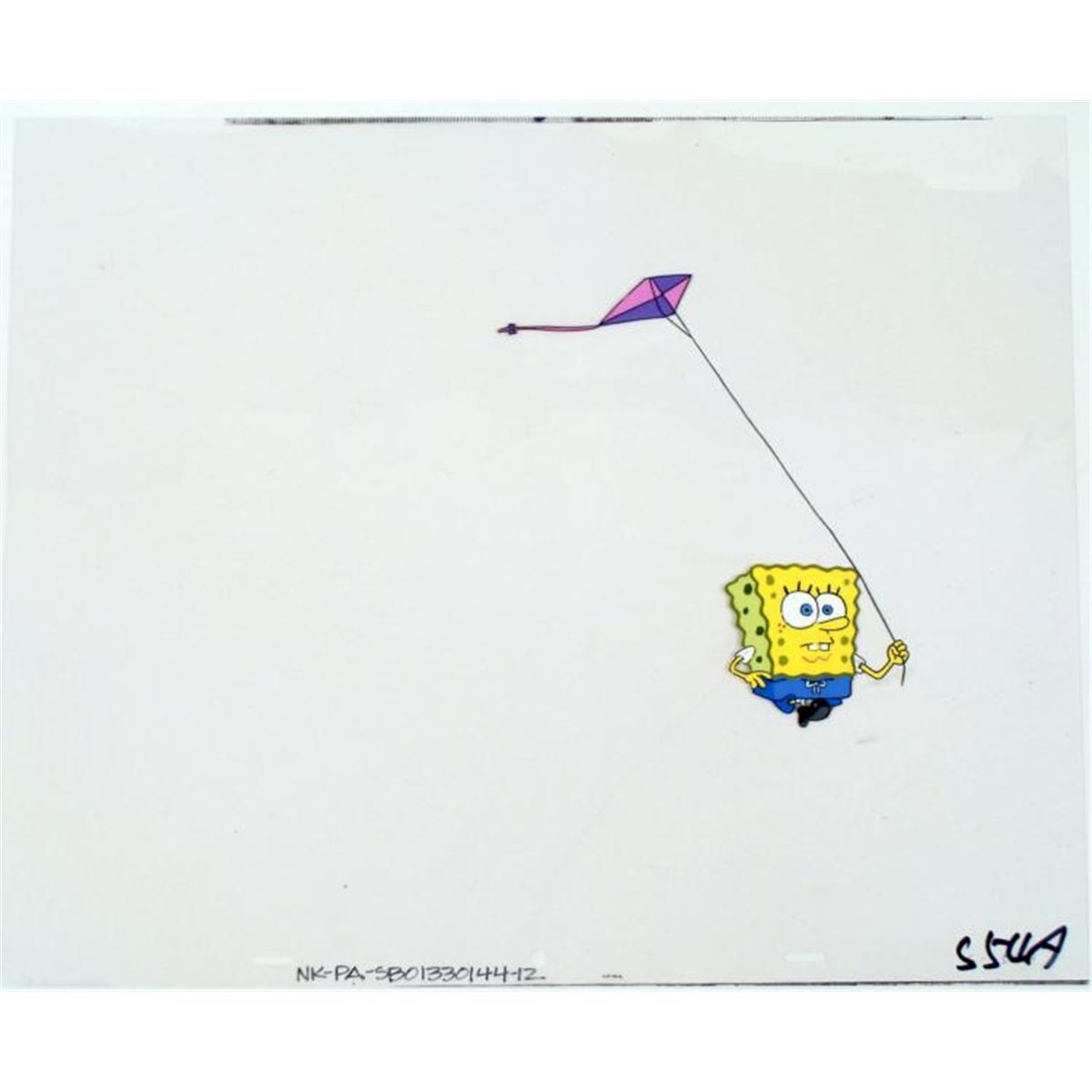This original hand-painted animation cel is from the Nickelodeon TVs how SpongeBob Squarepants. The story takes place under the deep blue sea in Bikini Bottom, where SpongeBob resides. SpongeBob, who is a yellow, porous sponge, is your typical happy-go-lucky character, as he is always cheerful and enjoys making people laugh. Patrick Star, SpongeBob's neighbor who is a starfish, boasts knowing nothing and is often getting himself into ridiculous situations. Between the homes of these two lies the home of the miserable Squidward, a squid, who is known for being grouchy and playing tricks on SpongeBob and Patrick. Both SpongeBob and Squidward work at the Krusty Krab, a fast food business run by the greedy money-loving Mr. Krabs, a crab, the arch rival of the evil, possibly misunderstood, Plankton. Another neighbor, Sandy Cheeks, an athletic squirrel who normally wears an astronaut's space suit, was introduced in "Tea at the Treedome." She spends most of her time inventing and experimenting.Let's go fly a kite, SpongeBob! * * Original Production Background Overall Size of cel 13 1/2" x 16 1/2" Very good conditionEach one-of-a-kind set-up represents a slight change in position of the characters. When individually photographed and projected in rapid succession, the images appear to move. * To create production cels, the original animator's drawing is transferred onto an acetate cel (by hand-inking and/or photo copying). The cel is then hand-painted on the reverse side. * The bottom of the sheet has peg holes, and the animator's notations. * Note: The cel you receive may look ever so slightly different from the one shown here. *