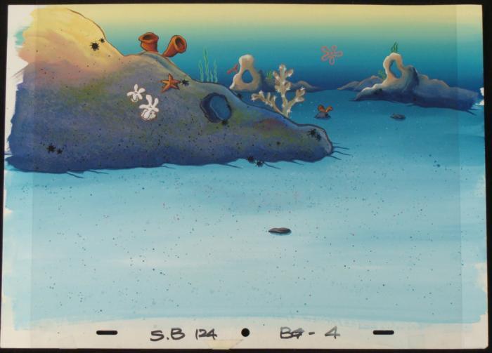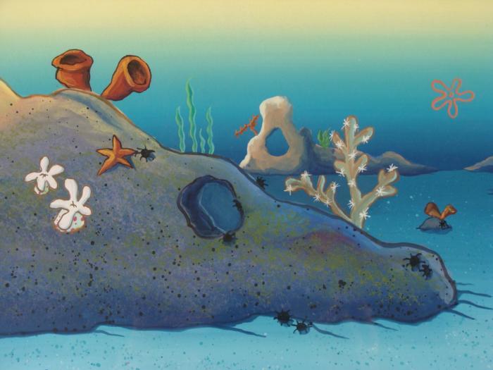 This original hand-painted background and animation cel are from the Nickelodeon TV show SpongeBob Squarepants. The story takes place under the deep blue sea in Bikini Bottom, where SpongeBob resides. SpongeBob, who is a yellow, porous sponge, is your typical happy-go-lucky character, as he is always cheerful and enjoys making people laugh. Patrick Star, SpongeBob's neighbor who is a starfish, is your average children's show idiot, as he boasts knowing nothing and is often getting himself into ridiculous situations. Between the homes of these two lies the home of the miserable Squidward, a squid, who is known for being grouchy and playing tricks on SpongeBob and Patrick. Both SpongeBob and Squidward work at the Krusty Krab, a fast food business run by the greedy money-loving Mr. Krabs, a crab, the arch rival of the evil, possibly misunderstood, Plankton. Another neighbor, Sandy Cheeks, an athletic squirrel who normally wears an astronaut's space suit, was introduced in "Tea at the Treedome." She spends most of her time inventing and experimenting. This seems to be a rocky field under the sea.Original Production Background and Animated Cel Overall Size of Background: 10 1/2" x 14" Overall Size of the Cel: 10 1/2" x 12 1/2" Very good condition; it has been stored This is an original hand-painted cel set-up used in the production of an episode of "SpongeBob SquarePants." Each one-of-a-kind set-up represents a slight change in position of the characters. When individually photographed and projected in rapid succession, the images appear to move.