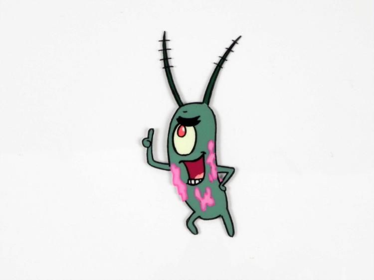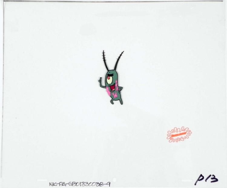 Normal 0 false false false MicrosoftInternetExplorer4 /* Style Definitions */ table.MsoNormalTable{mso-style-name:"Table Normal";mso-tstyle-rowband-size:0;mso-tstyle-colband-size:0;mso-style-noshow:yes;mso-style-parent:"";mso-padding-alt:0in 5.4pt 0in 5.4pt;mso-para-margin:0in;mso-para-margin-bottom:.0001pt;mso-pagination:widow-orphan;font-size:10.0pt;font-family:"Times New Roman";mso-ansi-language:#0400;mso-fareast-language:#0400;mso-bidi-language:#0400;}This original animation cel is from the Nickelodeon TV showSpongeBob Squarepants. The story takes place under the deep blue seain Bikini Bottom, where SpongeBob resides. SpongeBob, who is a yellow,porous sponge, is your typical happy-go-lucky character, as he is alwayscheerful and enjoys making people laugh. Patrick Star, SpongeBob's neighbor whois a starfish, is your average children's show idiot, as he boasts knowingnothing and is often getting himself into ridiculous situations. Between the homesof these two lies the home of the miserable Squidward, a squid, who is knownfor being grouchy and playing tricks on SpongeBob and Patrick. Both SpongeBoband Squidward work at the Krusty Krab, a fast food business run by the greedymoney-loving Mr. Krabs, a crab, the arch rival of the evil, possiblymisunderstood, Plankton. Another neighbor, Sandy Cheeks, an athletic squirrelwho normally wears an astronaut's space suit, was introduced in "Tea atthe Treedome." She spends most of her time inventing andexperimenting. * You think you're more clever than me?? HA, that makes me chuckle inside... * * Original Production Animated Cel Overall Size of Cel: 10 1/2" x 12 1/2" Excellent ConditionThis is an original hand-painted cel set-up used in the productionof an episode of "SpongeBob SquarePants." Each one-of-a-kind set-uprepresents a slight change in position of the characters. When individuallyphotographed and projected in rapid succession, the images appear to move. * To create production cels, the original animator's drawing is transferred ontoan acetate cel (by hand-inking and/or photo copying). The cel is thenhand-painted on the reverse side. * The cel received by the winning bidder may be ever so slightly differentfrom the one in the auction photos. * The cel is ready to be matted andframed. The animator's notations are atthe bottom of the cel. The Nickelodeon logo is located at the bottom right of the cel. * *