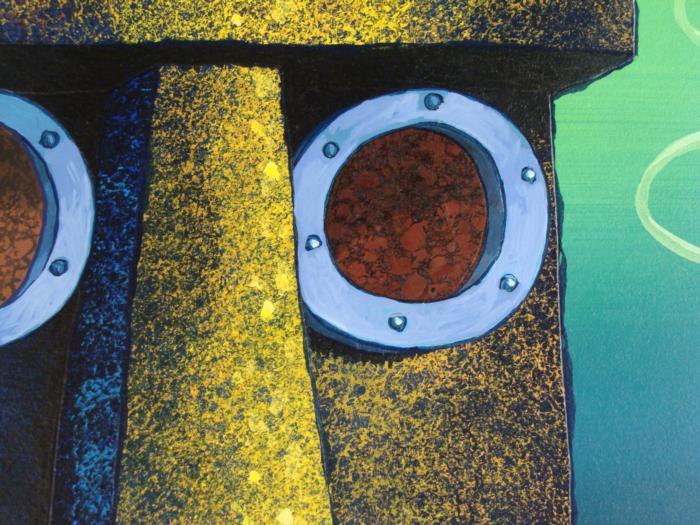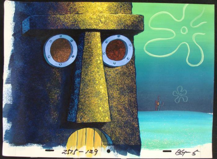 This original hand-painted background from the Nickelodeon TV show SpongeBob Squarepants. The story takes place under the deep blue sea in Bikini Bottom, where SpongeBob resides. SpongeBob, who is a yellow, porous sponge, is your typical happy-go-lucky character, as he is always cheerful and enjoys making people laugh. Patrick Star, SpongeBob's neighbor who is a starfish, is your average children's show idiot, as he boasts knowing nothing and is often getting himself into ridiculous situations. Between the homes of these two lies the home of the miserable Squidward, a squid, who is known for being grouchy and playing tricks on SpongeBob and Patrick. Both SpongeBob and Squidward work at the Krusty Krab, a fast food business run by the greedy money-loving Mr. Krabs, a crab, the arch rival of the evil, possibly misunderstood, Plankton. Another neighbor, Sandy Cheeks, an athletic squirrel who normally wears an astronaut's space suit, was introduced in "Tea at the Treedome." She spends most of her time inventing and experimenting. In this background is an close up look at the front of Squidward's house.Original Production Background Overall Size of Background: 10 1/2" x 14 1/4" Very good condition; it has been stored rolledOriginal Production Backgrounds are used in the making of the final version of animated productions. The background establishes the location and the overall good mood of the scenee. Typically, a background layout artist creates a drawing to establish the content of the scene, placement of characters, perspective and camera angle. Based on this drawing, the background artist creates a preliminary painting to confirm all of the scenes details, then the final production background which is used in the filming of the scene. When these backgrounds are individually photographed behind the progression of production cels, and projected at a rapid succession, the images in the foreground appear to move, creating an animated scene. The background is ready to be matted and framed. It is a colored background with the animator's notations at the bottom.