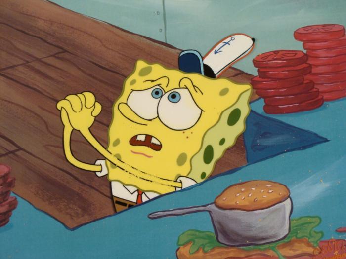 This animation cel and reproduction background are from the Nickelodeon TV show SpongeBob Squarepants. The story takes place under the deep blue sea in Bikini Bottom, where SpongeBob resides. SpongeBob, who is a yellow, porous sponge, is your typical happy-go-lucky character, as he is always cheerful and enjoys making people laugh. Patrick Star, SpongeBob's neighbor who is a starfish, is your average children's show idiot, as he boasts knowing nothing and is often getting himself into ridiculous situations. Between the homes of these two lies the home of the miserable Squidward, a squid, who is known for being grouchy and playing tricks on SpongeBob and Patrick. Both SpongeBob and Squidward work at the Krusty Krab, a fast food business run by the greedy money-loving Mr. Krabs, a crab, the arch rival of the evil, possibly misunderstood, Plankton. Another neighbor, Sandy Cheeks, an athletic squirrel who normally wears an astronaut's space suit, was introduced in "Tea at the Treedome." She spends most of her time inventing and experimenting. It looks like Spongebob begging someone for something he might have done wrong.Original Printed Background and Animated Cel Overall Size of Background: 11" x 13 1/2" Overall Size of the Cel: 10 1/2" x 12 1/2" Very good condition This is an original hand-painted cel set-up used in the production of an episode of "SpongeBob SquarePants." Each one-of-a-kind set-up represents a slight change in position of the characters. When individually photographed and projected in rapid succession, the images appear to move.