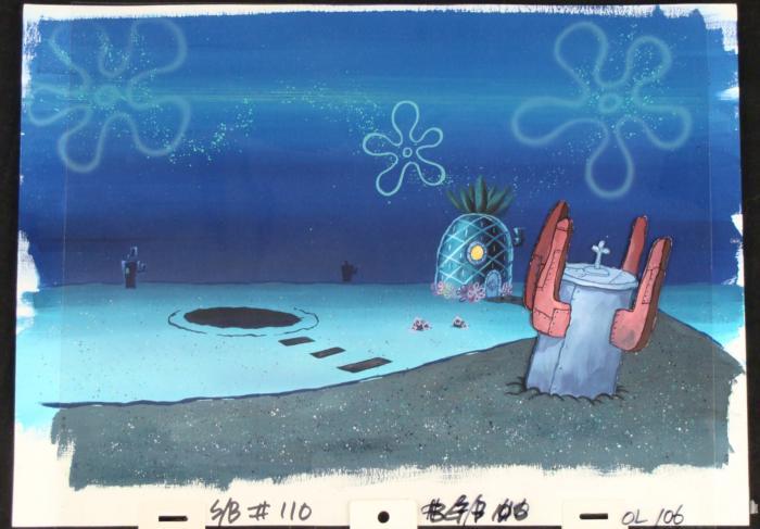This original hand-painted background and animation cel are from the Nickelodeon TV show SpongeBob Squarepants. The story takes place under the deep blue sea in Bikini Bottom, where SpongeBob resides. SpongeBob, who is a yellow, porous sponge, is your typical happy-go-lucky character, as he is always cheerful and enjoys making people laugh. Patrick Star, SpongeBob's neighbor who is a starfish, is your average children's show idiot, as he boasts knowing nothing and is often getting himself into ridiculous situations. Between the homes of these two lies the home of the miserable Squidward, a squid, who is known for being grouchy and playing tricks on SpongeBob and Patrick. Both SpongeBob and Squidward work at the Krusty Krab, a fast food business run by the greedy money-loving Mr. Krabs, a crab, the arch rival of the evil, possibly misunderstood, Plankton. Another neighbor, Sandy Cheeks, an athletic squirrel who normally wears an astronaut's space suit, was introduced in "Tea at the Treedome." She spends most of her time inventing and experimenting. Original Production Background and Animated Cel Overall Size of Background: 10 1/2" x 14" Overall Size of the Cel: 10 1/2" x 12 1/2" Very good condition; it has been stored rolled This is an original hand-painted cel set-up used in the production of an episode of "SpongeBob SquarePants." Each one-of-a-kind set-up represents a slight change in position of the characters. When individually photographed and projected in rapid succession, the images appear to move.