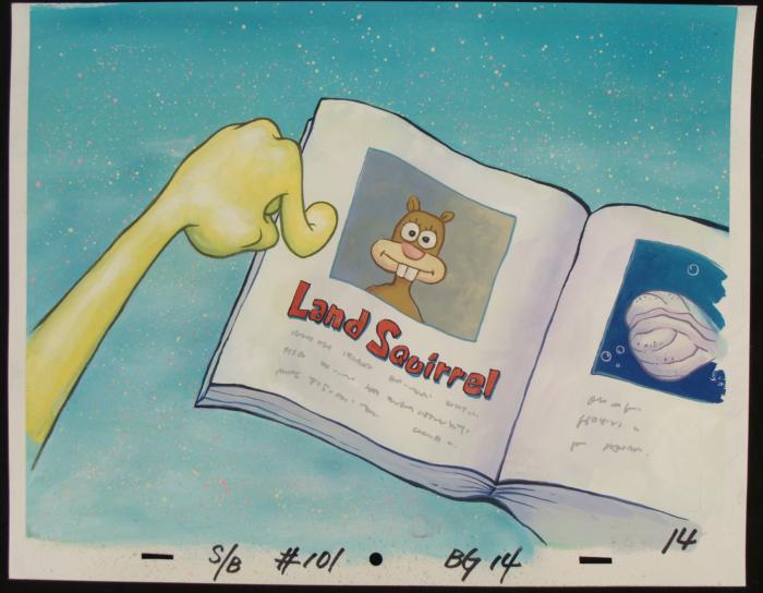 This original hand-painted background from the Nickelodeon TV show SpongeBob Squarepants. The story takes place under the deep blue sea in Bikini Bottom, where SpongeBob resides. SpongeBob, who is a yellow, porous sponge, is your typical happy-go-lucky character, as he is always cheerful and enjoys making people laugh. Patrick Star, SpongeBob's neighbor who is a starfish, is your average children's show idiot, as he boasts knowing nothing and is often getting himself into ridiculous situations. Between the homes of these two lies the home of the miserable Squidward, a squid, who is known for being grouchy and playing tricks on SpongeBob and Patrick. Both SpongeBob and Squidward work at the Krusty Krab, a fast food business run by the greedy money-loving Mr. Krabs, a crab, the arch rival of the evil, possibly misunderstood, Plankton. Another neighbor, Sandy Cheeks, an athletic squirrel who normally wears an astronaut's space suit, was introduced in "Tea at the Treedome." She spends most of her time inventing and experimenting. It seems Spongebob is learning about land squirrels.Original Production Background Overall Size of Background: 10 1/2" x 13 1/2" Very good condition; it has been storedOriginal Production Backgrounds are used in the making of the final version of animated productions. The background establishes the location and the overall good mood of the scene. Typically, a background layout artist creates a drawing to establish the content of the scene, placement of characters, perspective and camera angle. Based on this drawing, the background artist creates a preliminary painting to confirm all of the scenes details, then the final production background which is used in the filming of the scene. When these backgrounds are individually photographed behind the progression of production cels, and projected at a rapid succession, the images in the foreground appear to move, creating an animated scene. The background is ready to be matted and framed. It is a colored background with the animator's notations at the bottom.